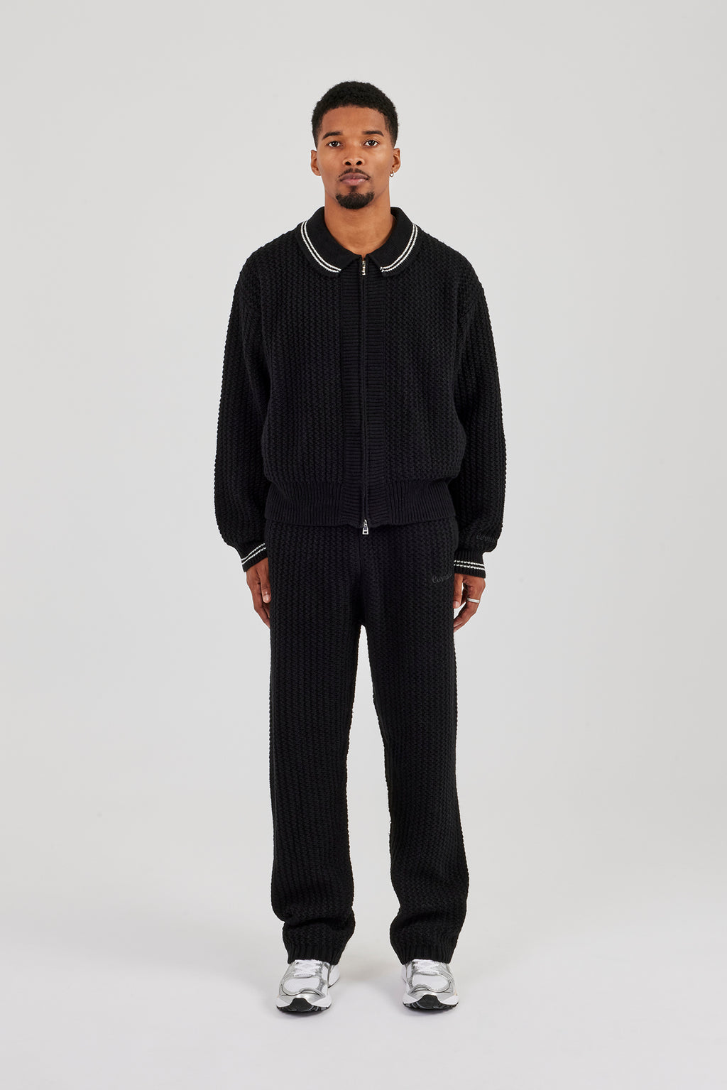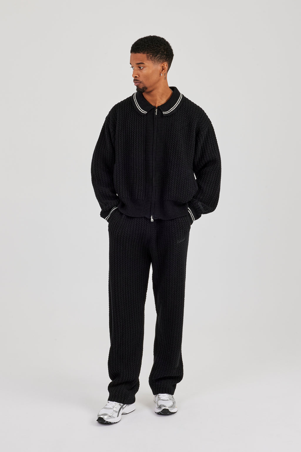 Black knitted zip through harrington in a boxy fit, featuring contrast stripe collar.