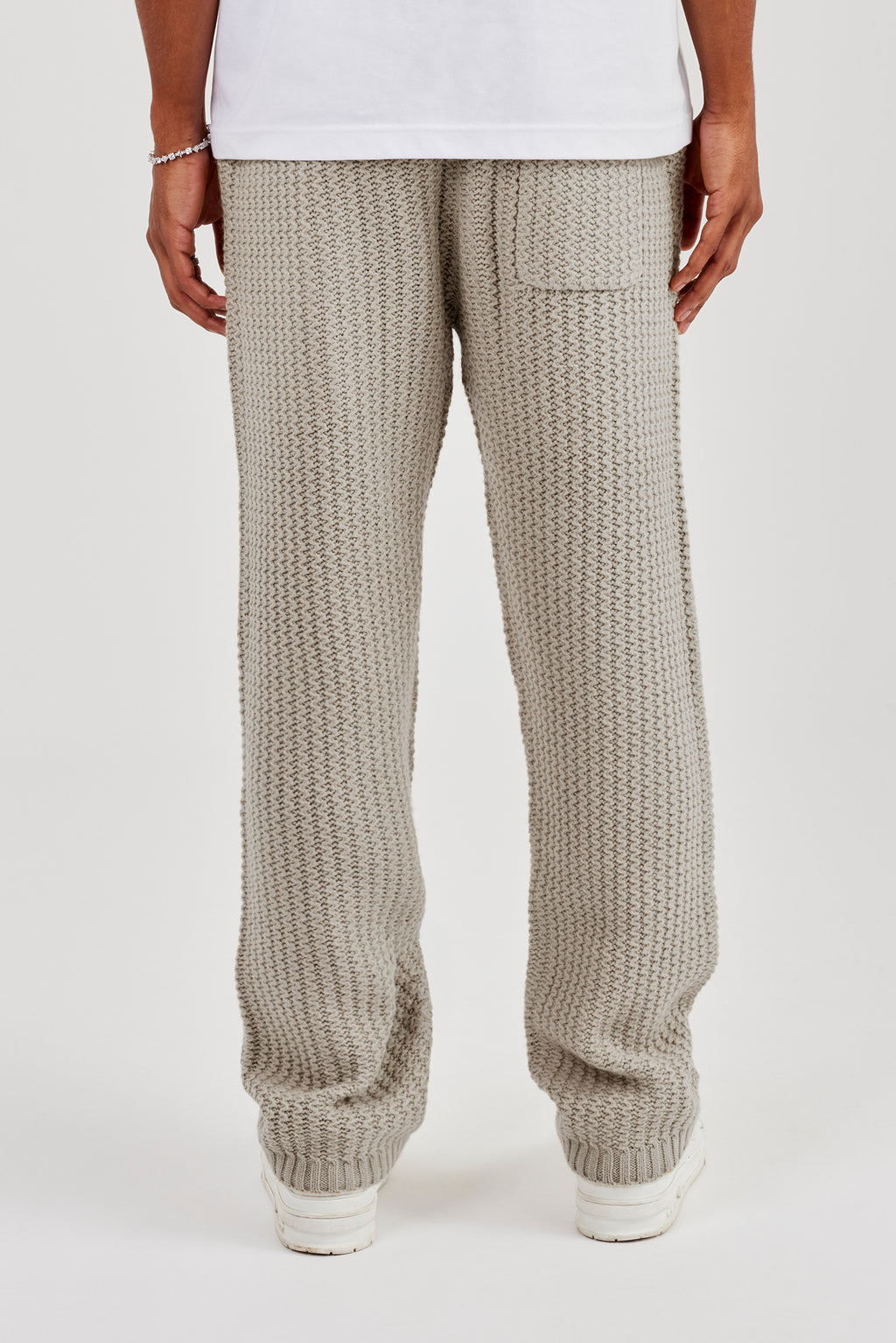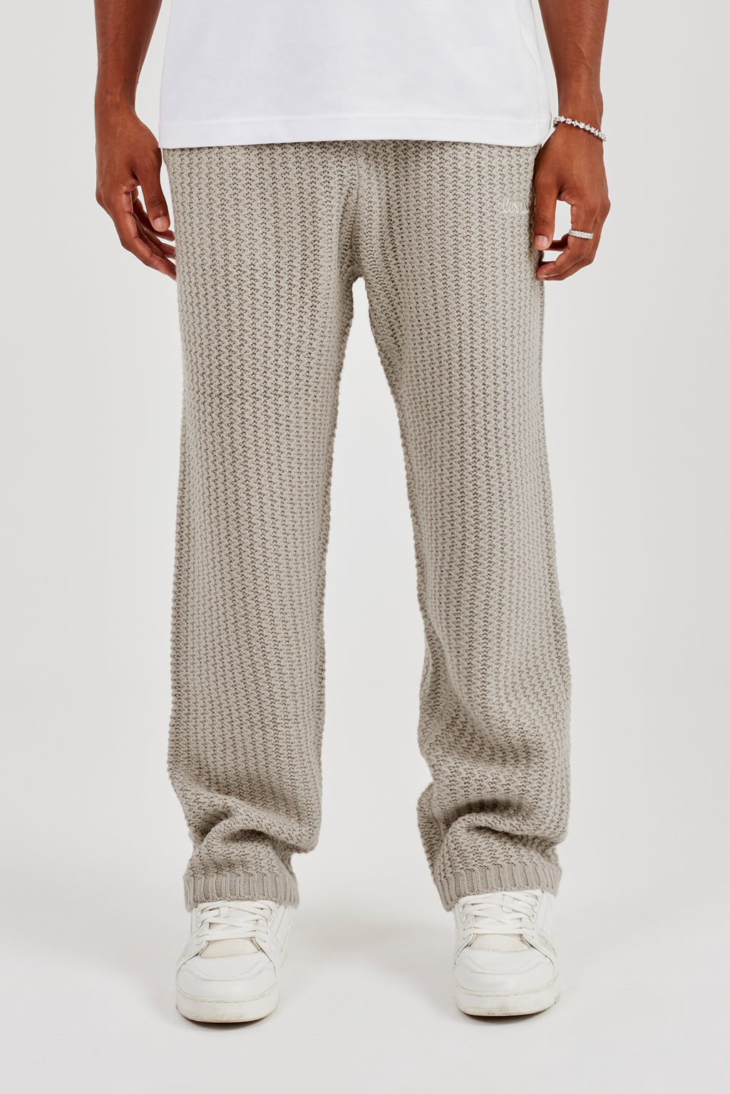 Taupe knitted jogger in a soft touch knit featuring tonal embroidery.