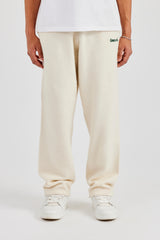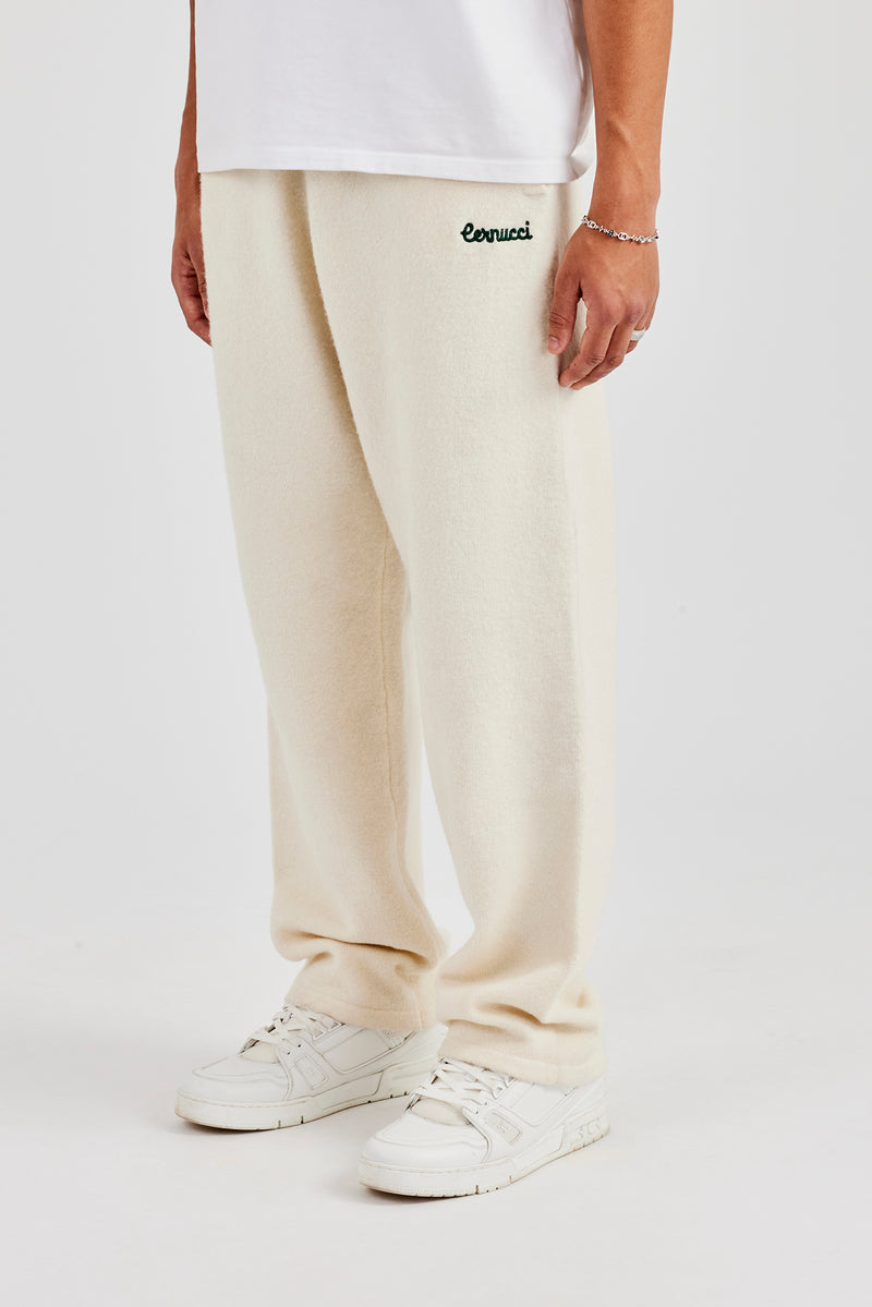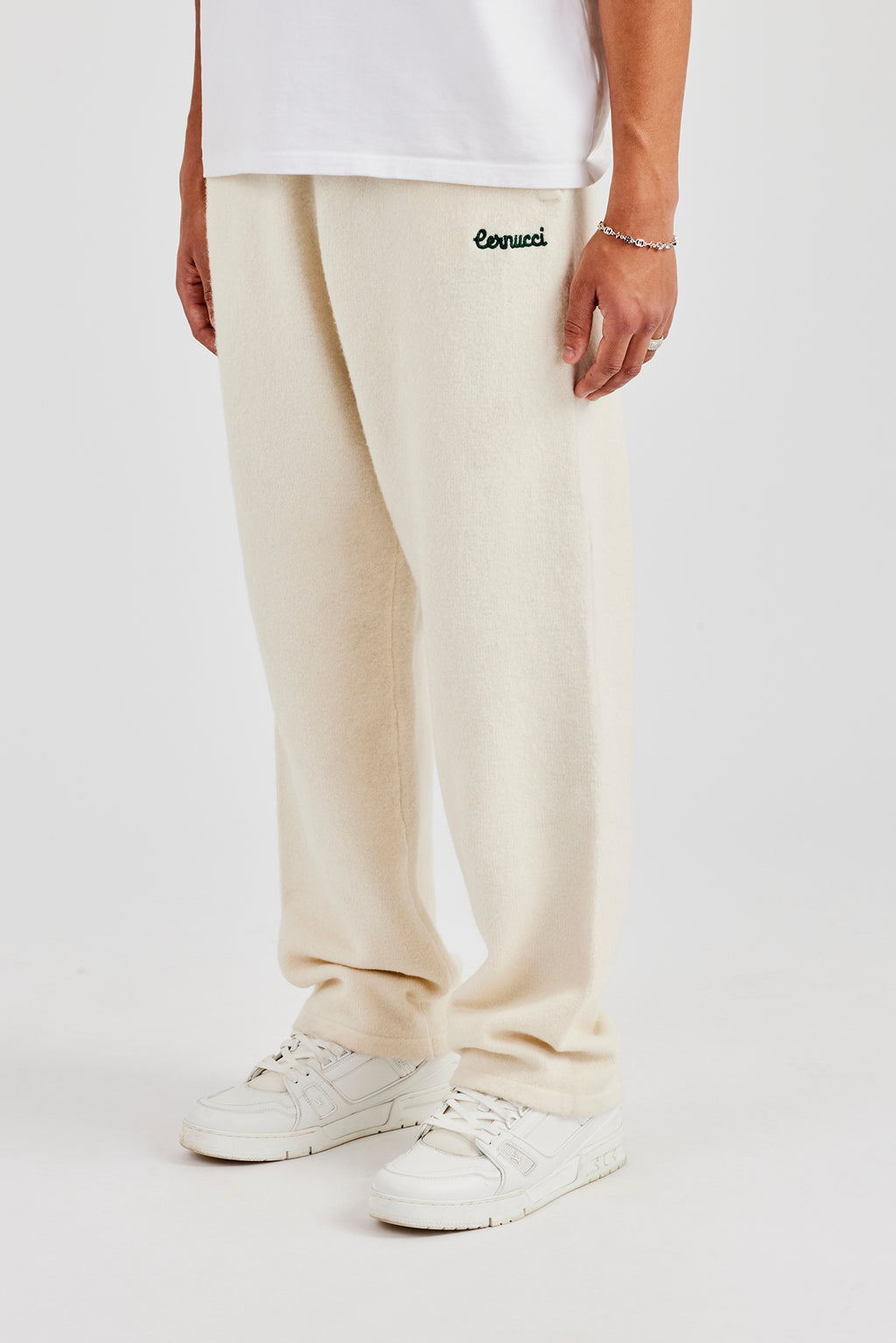 Ecru knitted straight leg jogger featuring contrast embroidery.