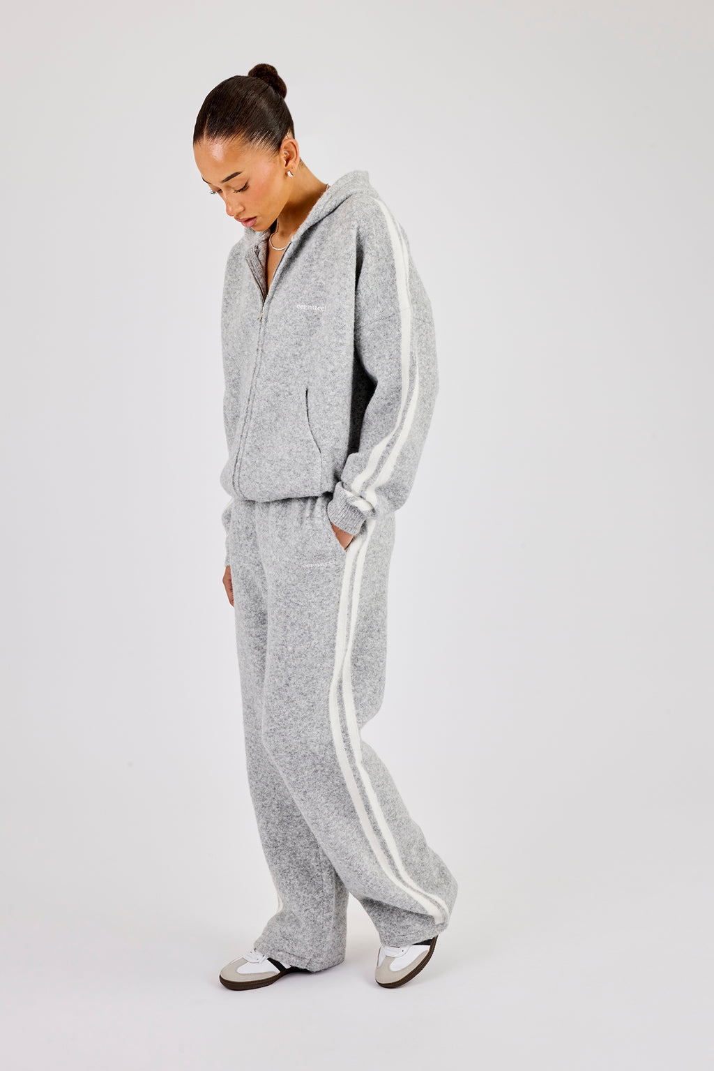 Grey wide leg jogger featuring contrast stripe detailing, in a soft touch knit. Pair with our matching zip through to complete the look.