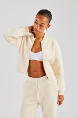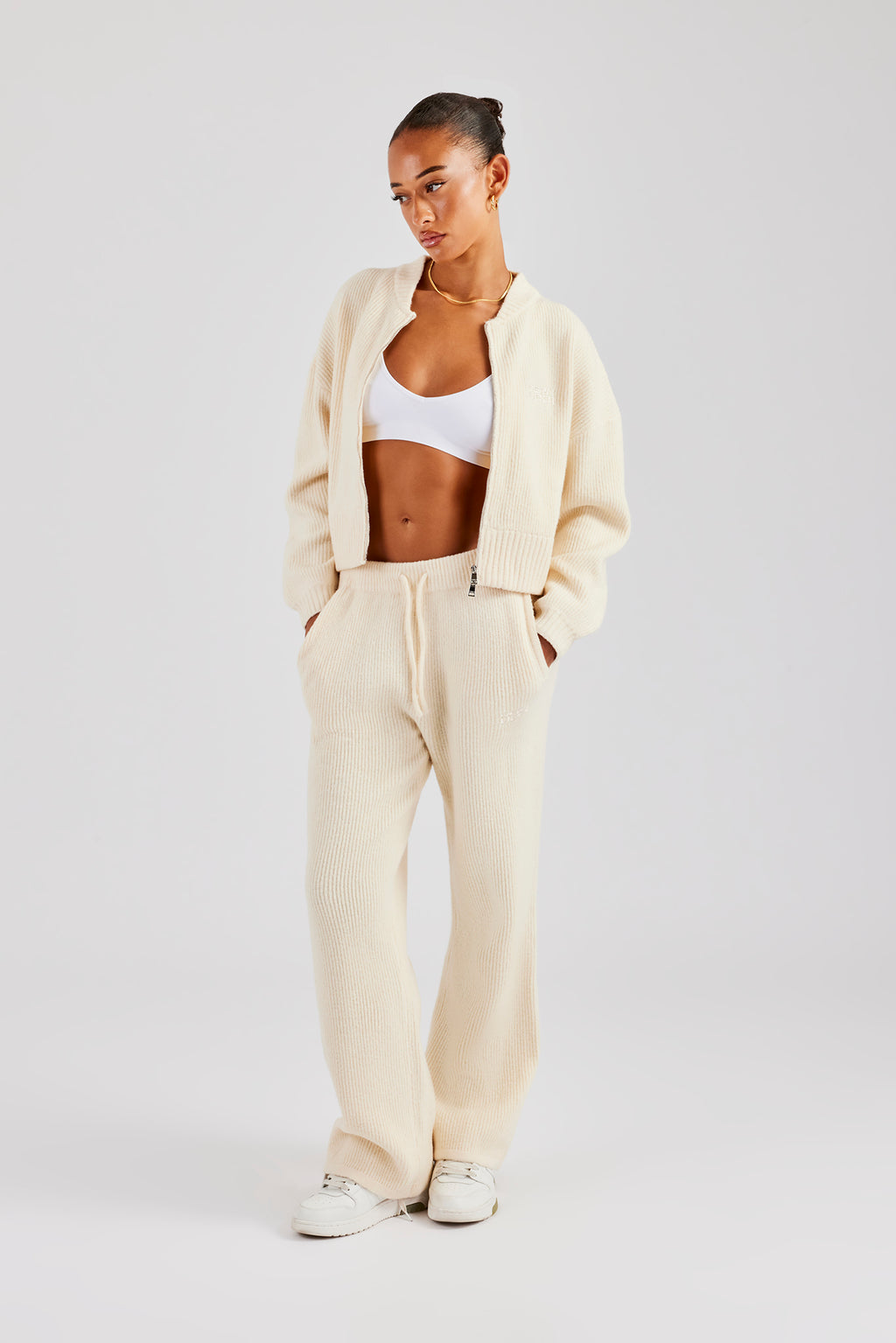Oatmeal zip front bomber in a soft touch knit with Cernucci branded embroidery.