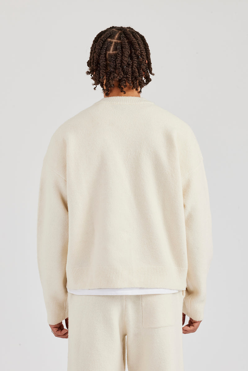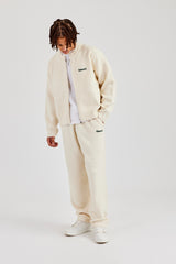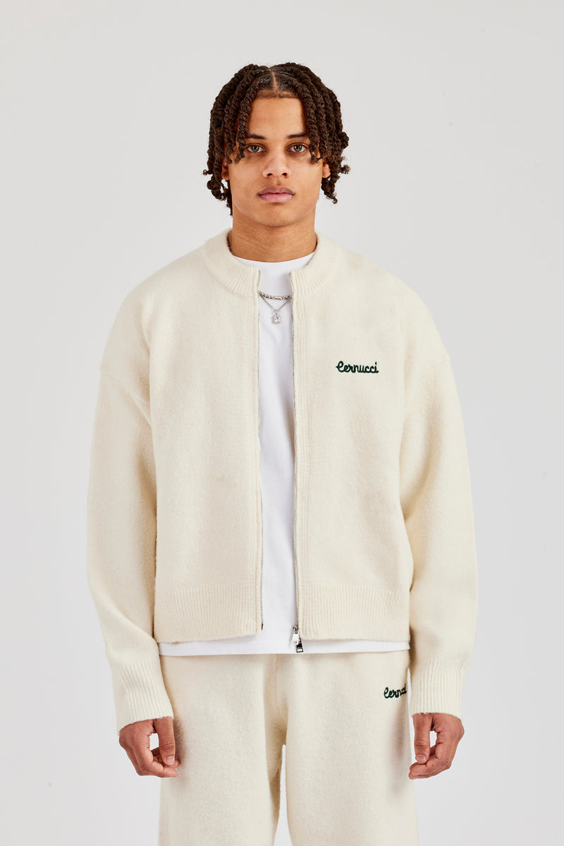 Ecru knitted zip through bomber featuring contrast embroidery in a boxy fit.