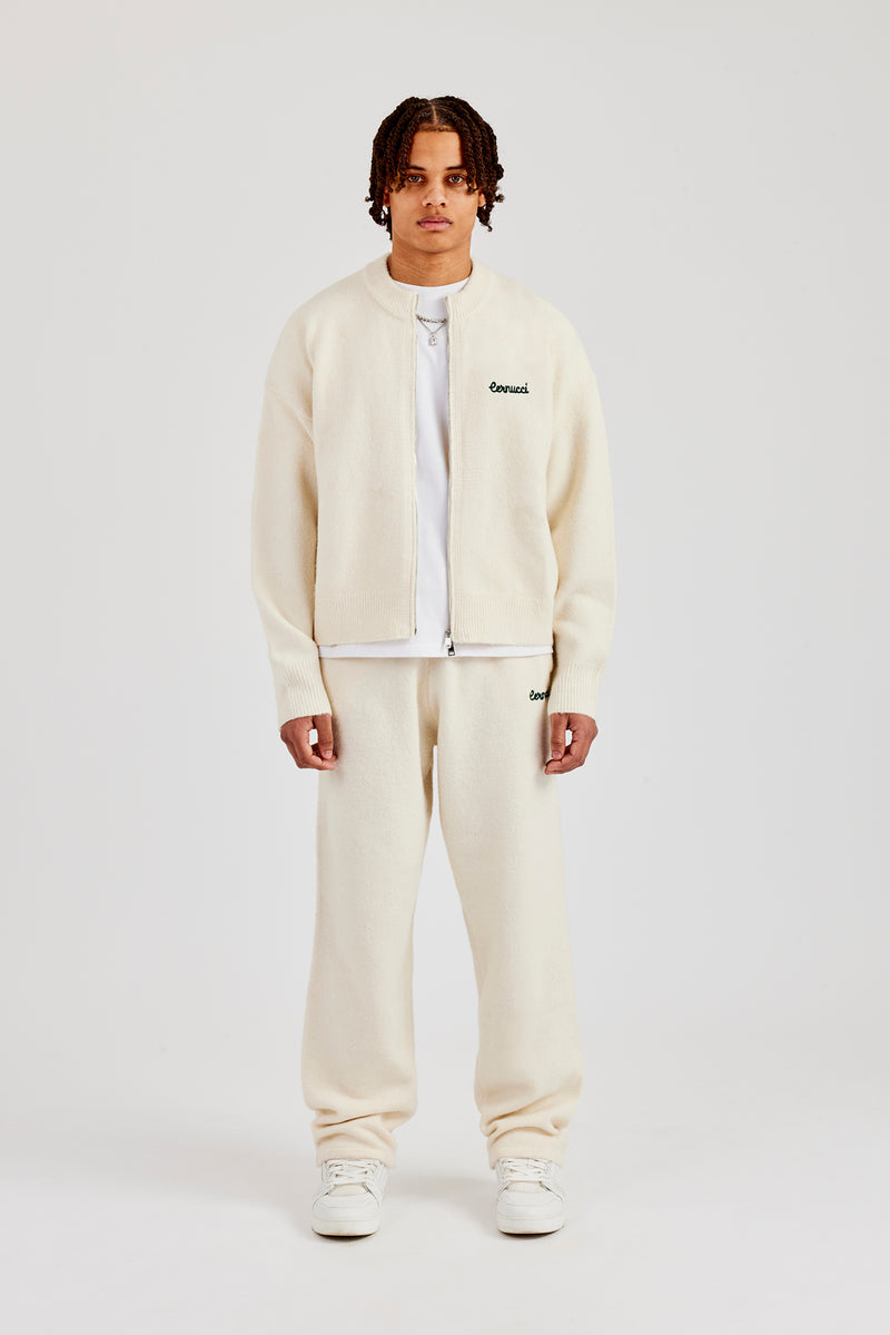 Ecru knitted straight leg jogger featuring contrast embroidery.