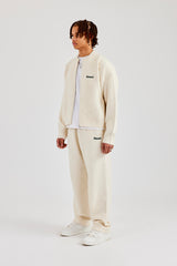 Ecru knitted zip through bomber featuring contrast embroidery in a boxy fit.