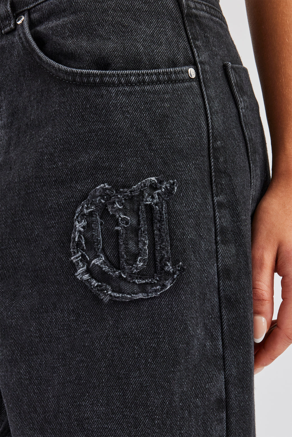 Washed Black jeans in a rigid cotton denim. Baggy fit finished with raw edge applique detail.
