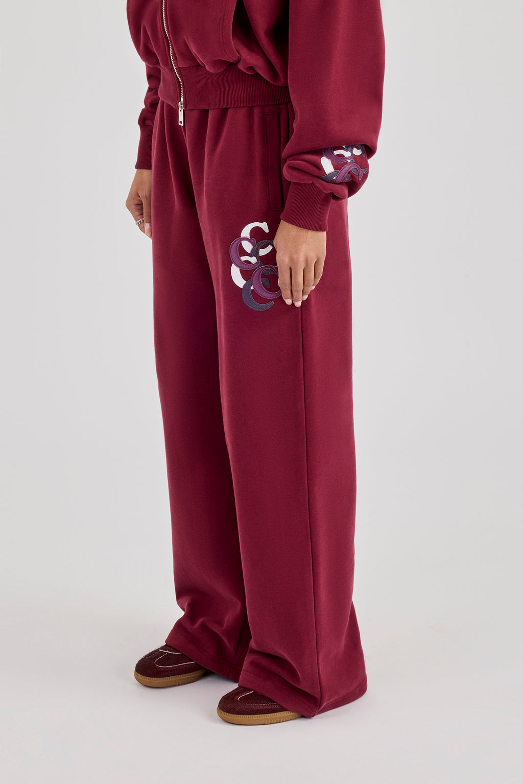 Burgundy wide leg jogger with layered applique branding. Premium soft touch jersey with Cernucci branded PU patch on centre back waistband.