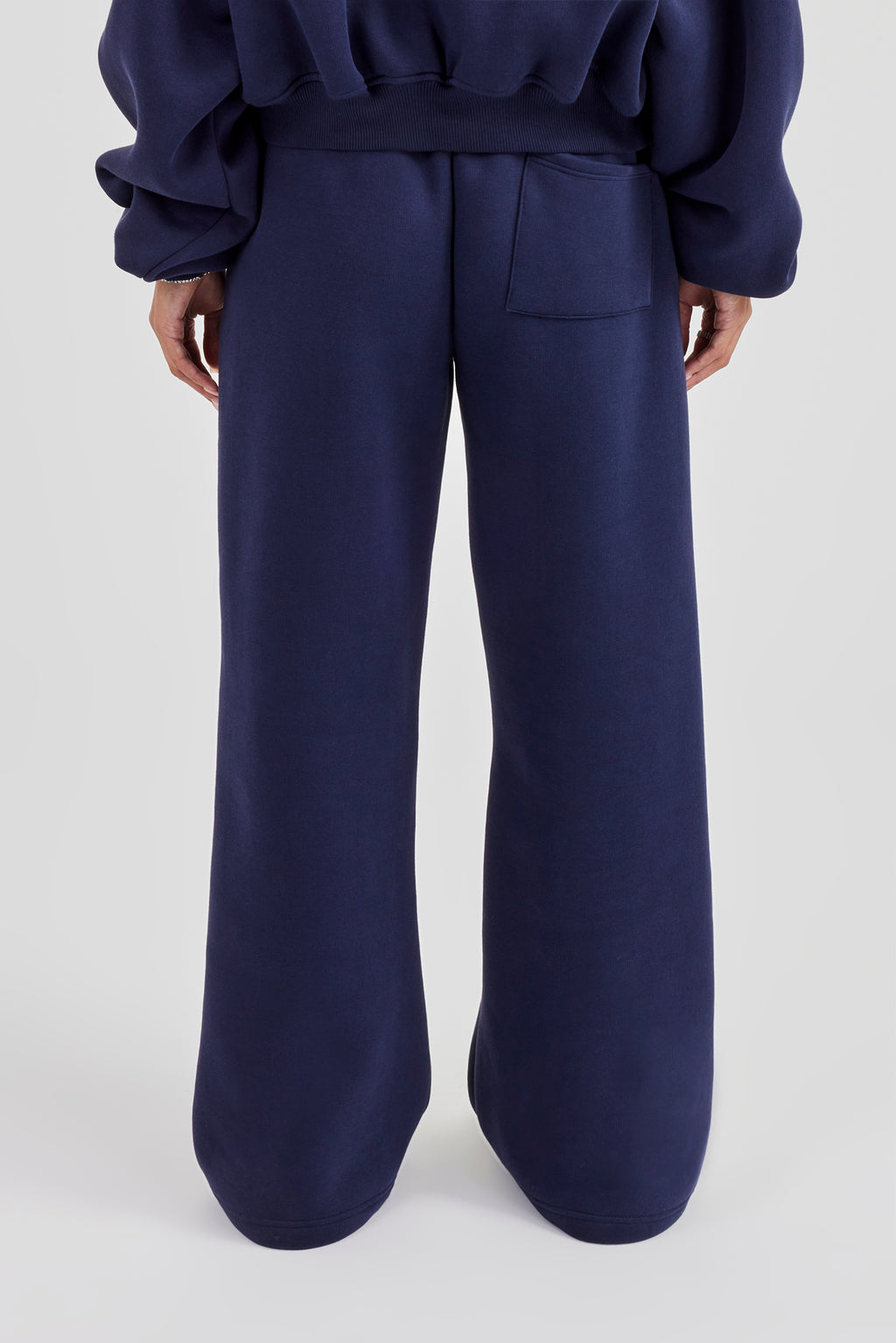 Logo tab navy jogger, in a wide leg fit. Premium soft touch jersey.
