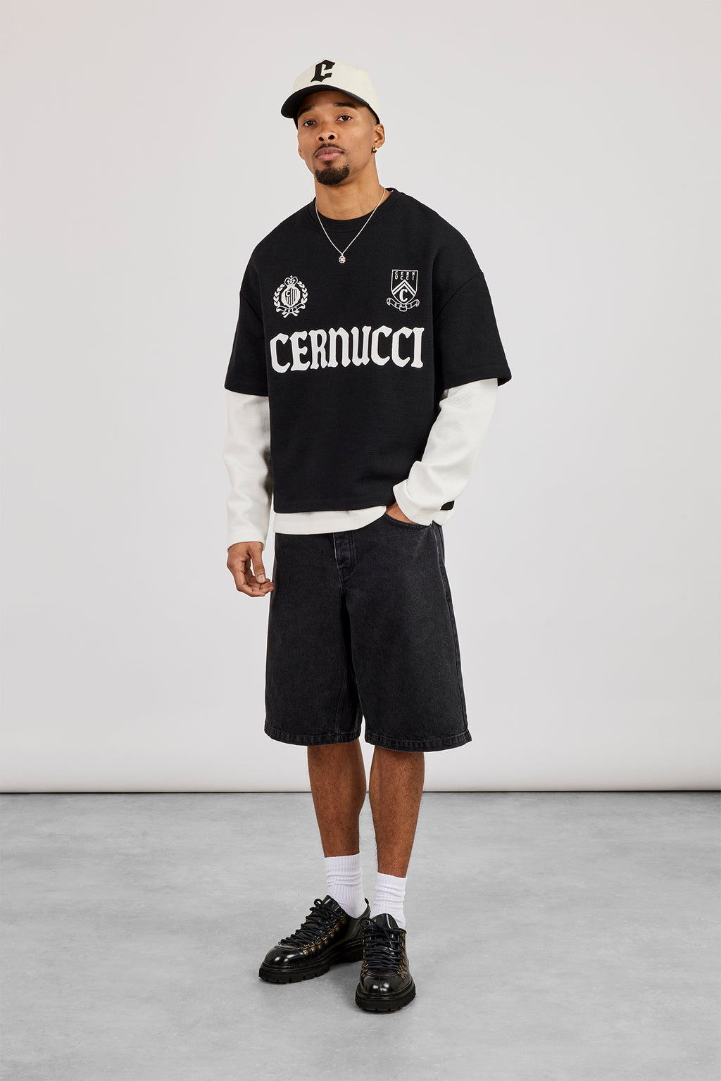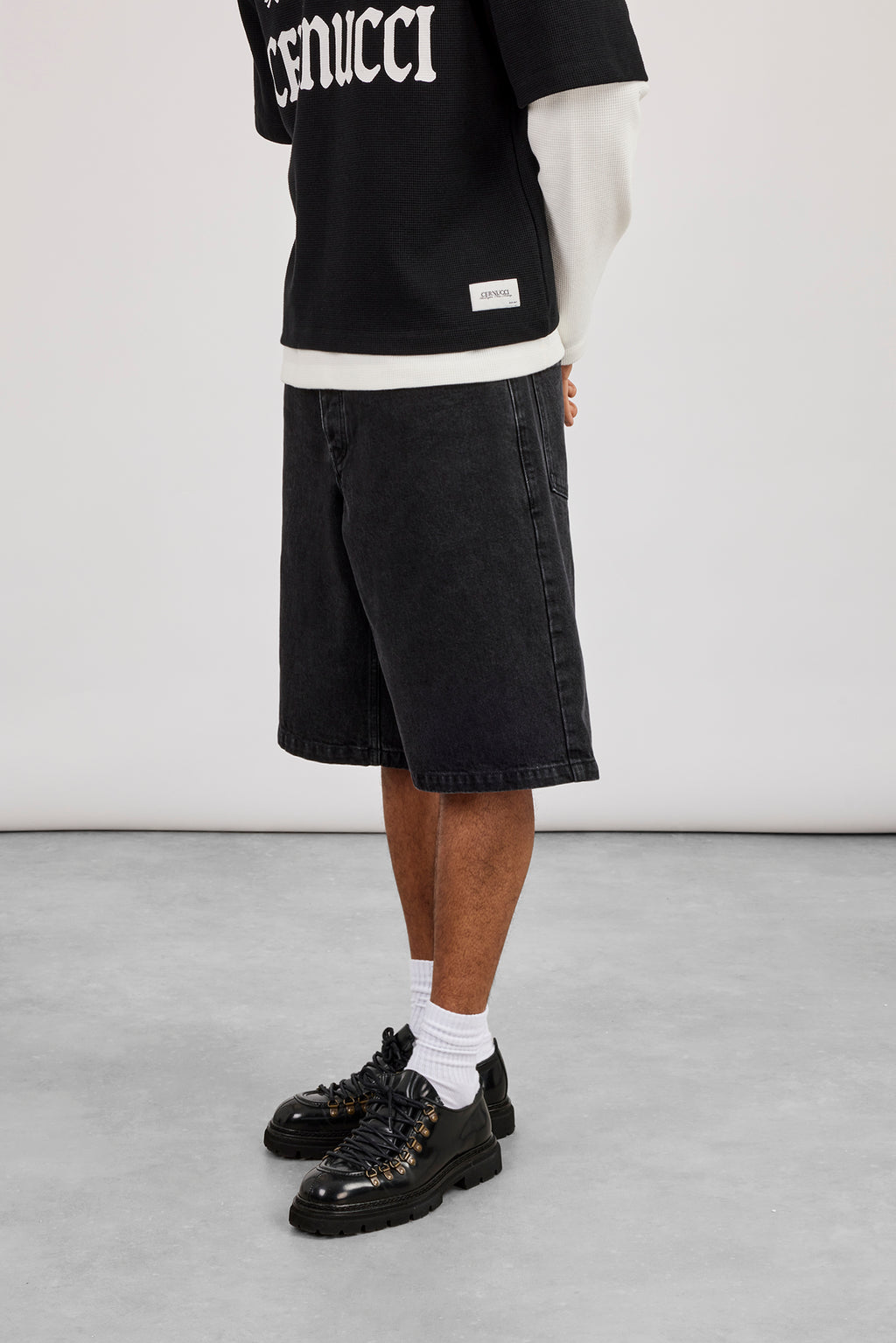 Washed black baggy denim jorts. Cotton rigid denim finished with branded trims.