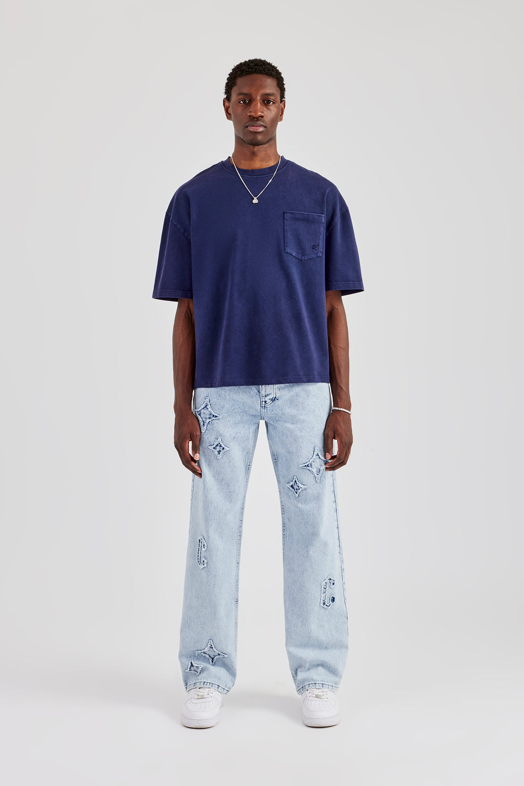 Ice blue wash jeans in a rigid cotton denim. Relaxed fit finished with side raw edge applique detail.