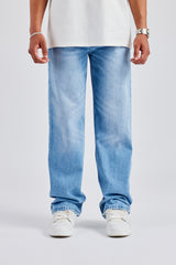 Vintage blue washed jeans, in rigid cotton denim. Relaxed fit finished with branded trims.
