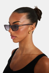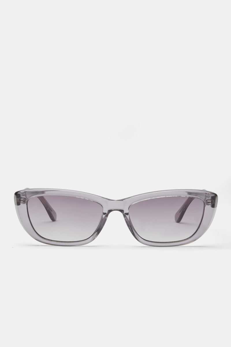 Narrow aviator sunglasses in a grey acetate frame with grey lenses and side gold branding.