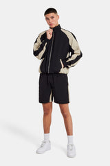 Nylon short with contrast side panel. Style with matching zip through jacket to complete the look.