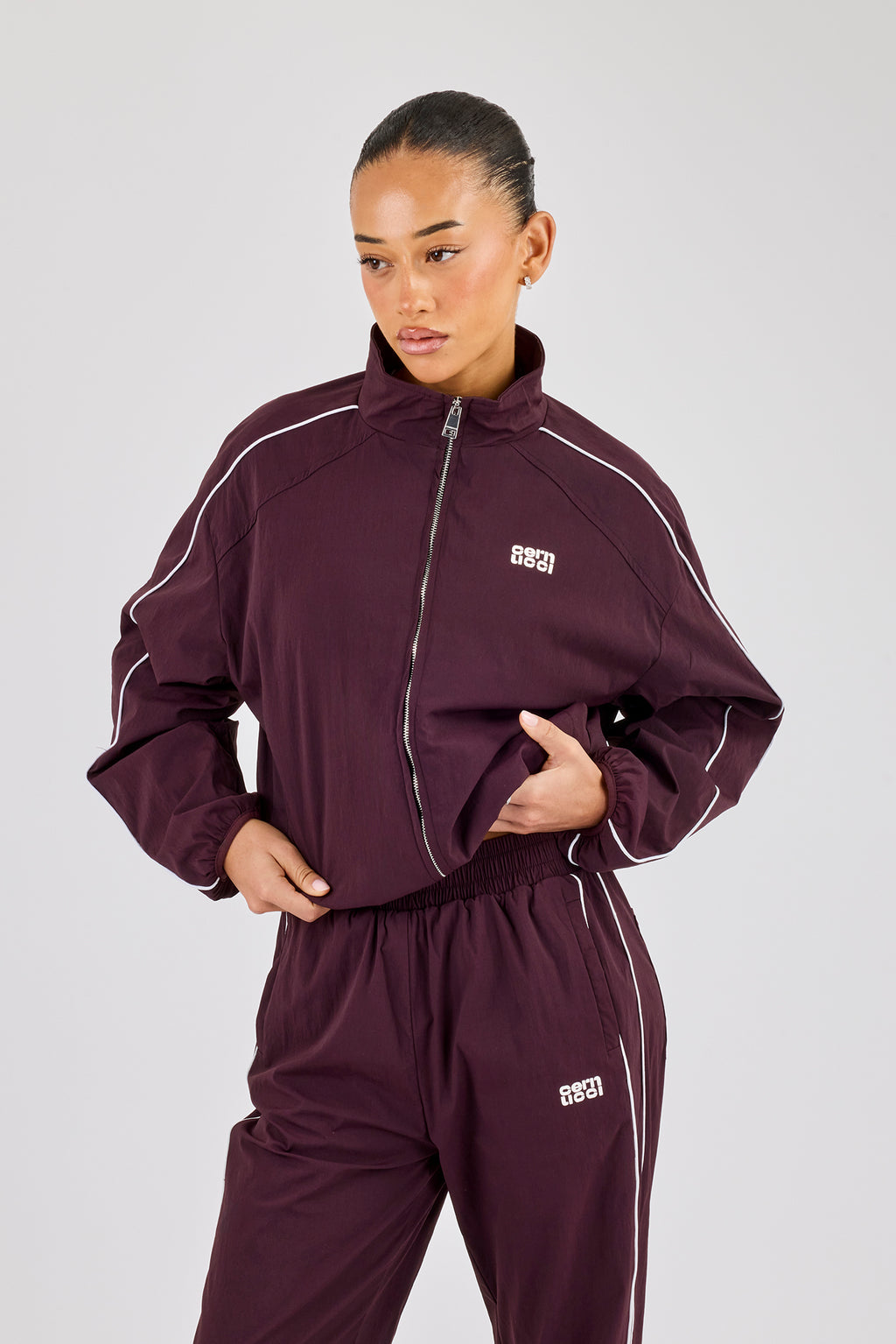 Burgundy nylon track jacket featuring contrast piping detail. Pair with our matching joggers.