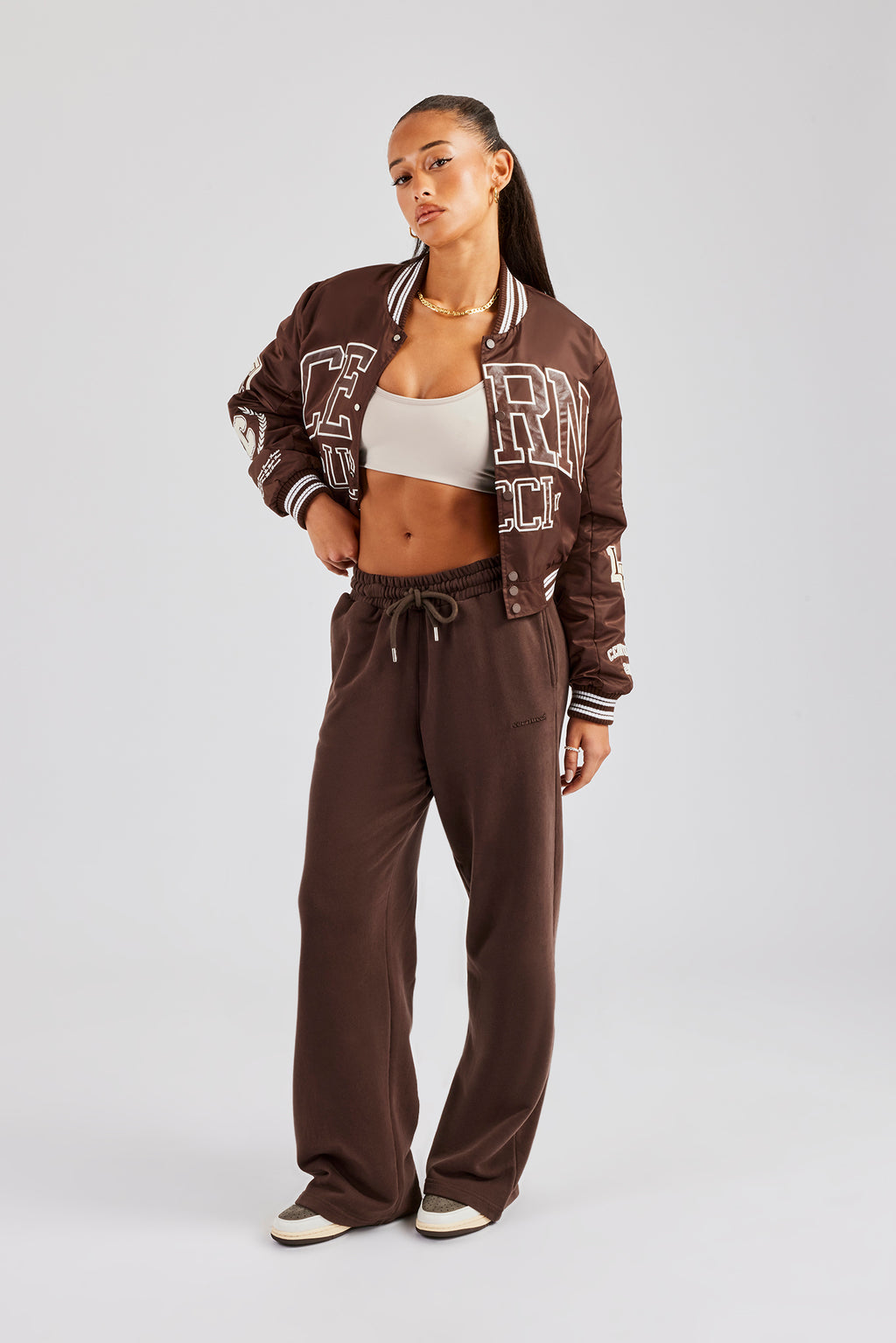 Chocolate nylon bomber jacket, featuring contrast applique branding and varsity rib cuff and hem. Pair with our antique wash jeans for full look.