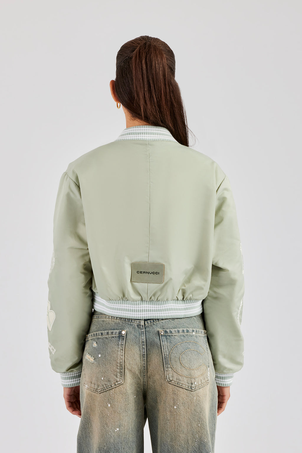 Sage green nylon bomber jacket, featuring contrast applique branding and varsity rib cuff and hem. Pair with our antique wash jeans for full look.