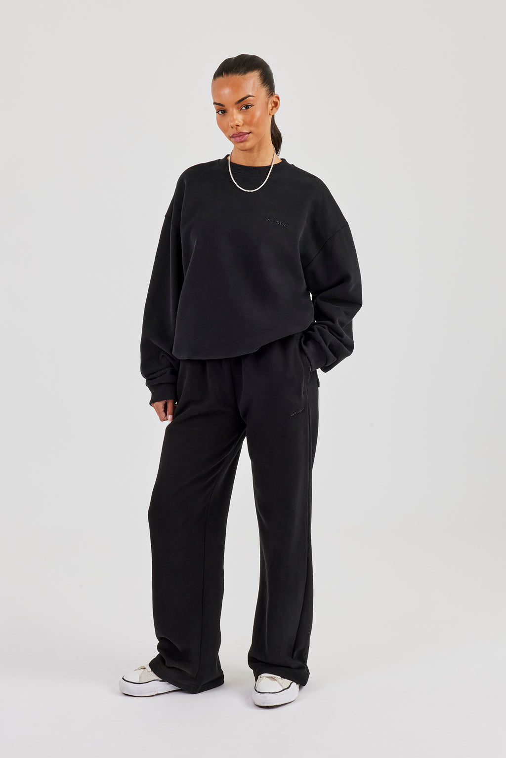 Black wide leg jogger. Premium soft touch jersey with Cernucci branded PU patch on centre back waistband.