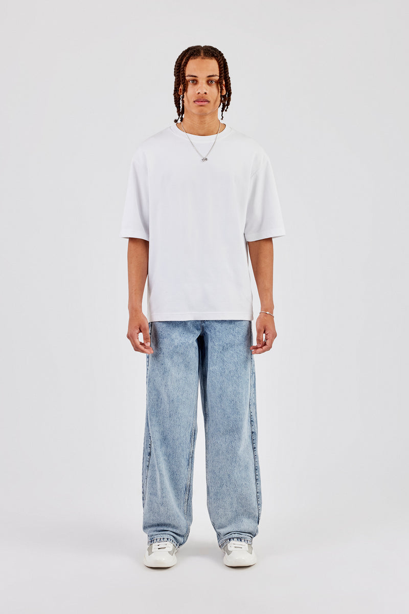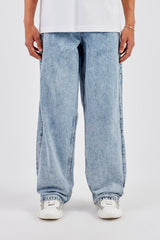 Light blue jeans, in rigid cotton denim. Baggy fit with panel detail.