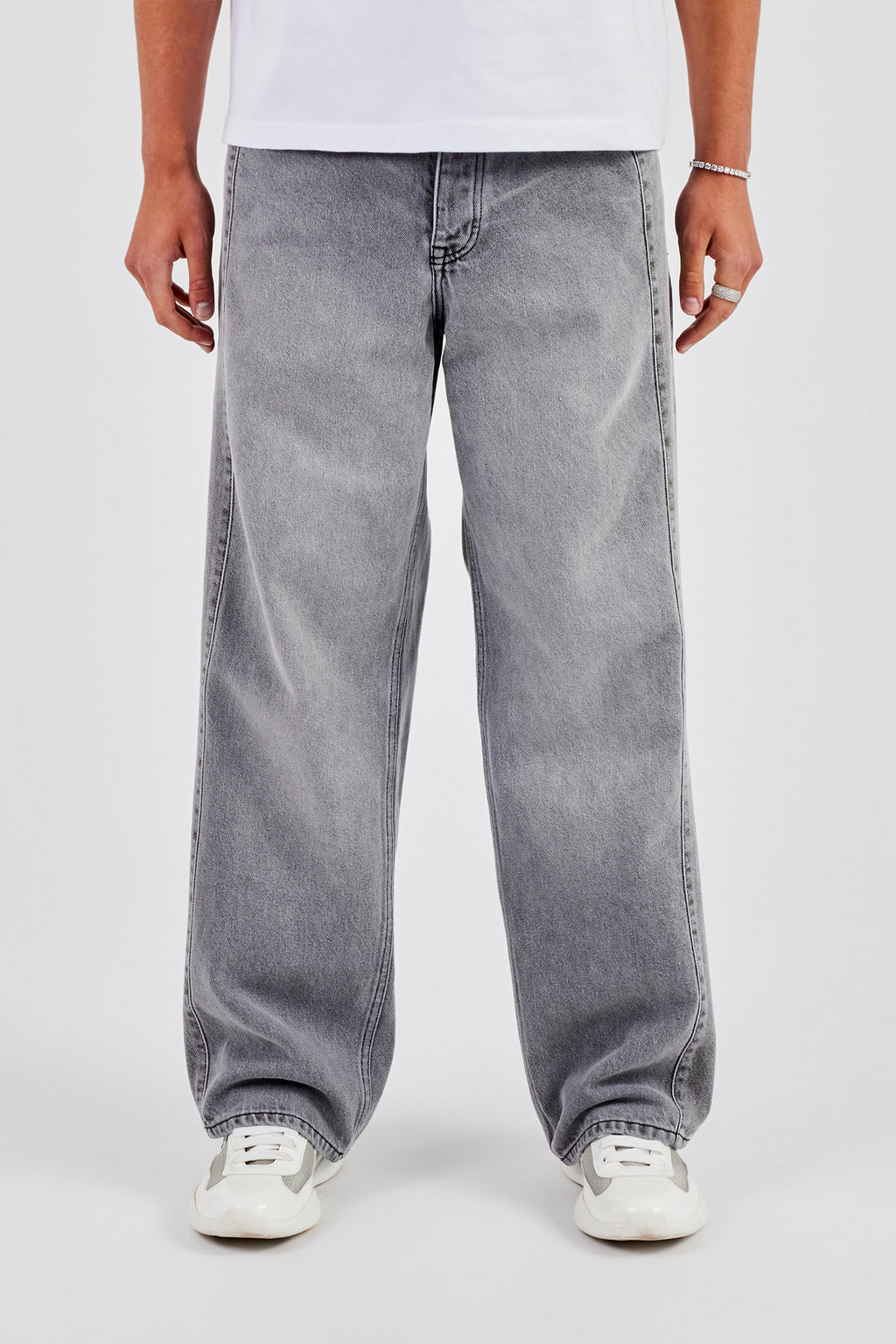 Washed grey jeans, in rigid cotton denim. Baggy fit with panel detail.
