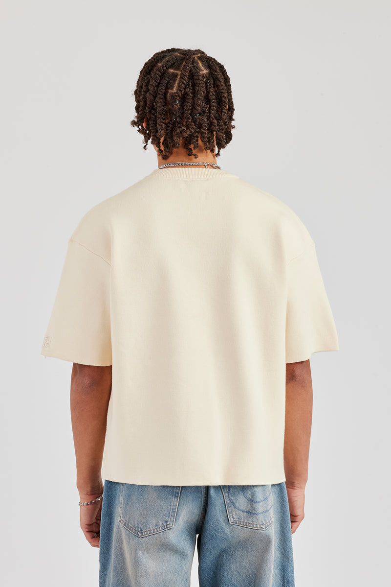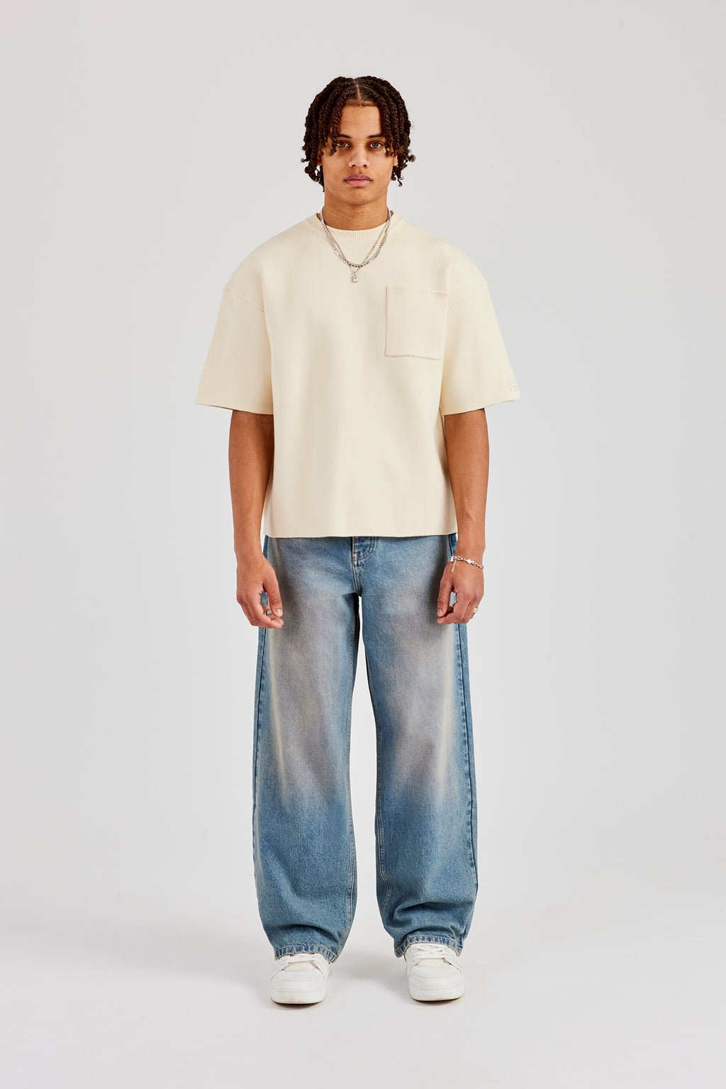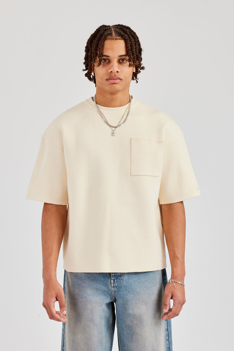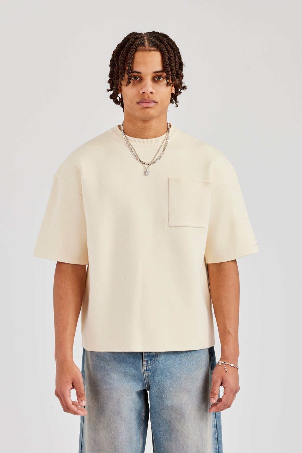 Off white boxy fit t-shirt in premium knit with front pocket detail. New t-shirt fits featuring our best selling oversized boxy fit, dropped shoulders and cropped body designed to sit on the waist.