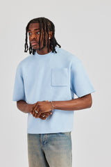 Powder blue boxy fit t-shirt in premium knit with front pocket detail. New t-shirt fits featuring our best selling oversized boxy fit, dropped shoulders and cropped body designed to sit on the waist.