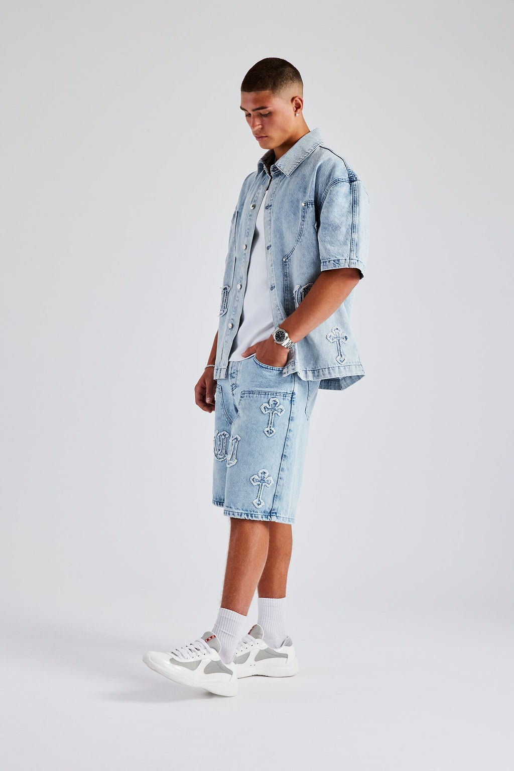 Our Raw edge applique carpenter denim shirt in a boxy fit . Made from premium, heavy weight denim fabric, in a Ice wash. Complete the look with our matching short. The ultimate combination.