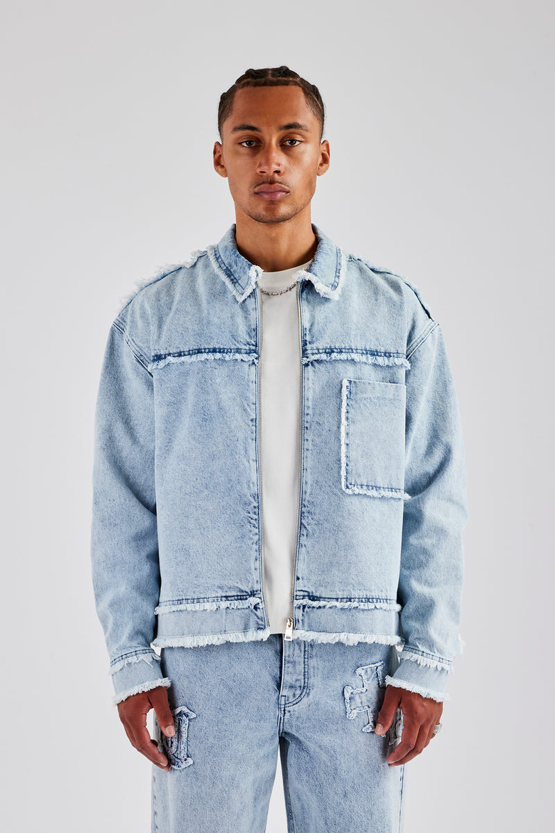 Iced blue denim zip jacket, a relaxed fit, in rigid cotton denim, featuring raw edge details. Pair with the raw edge shorts for a matching set or our applique jeans for the double denim look.