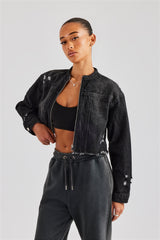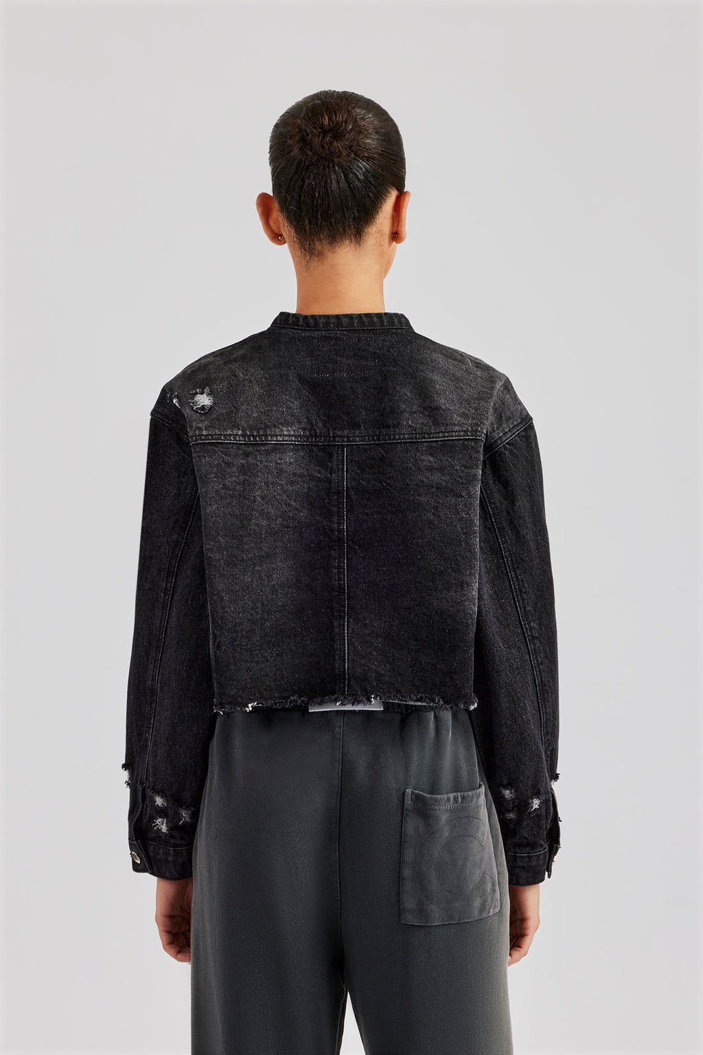 Collarless detail zip through jacket, made from mid weight premium denim. Featuring a raw hem and embossed branding