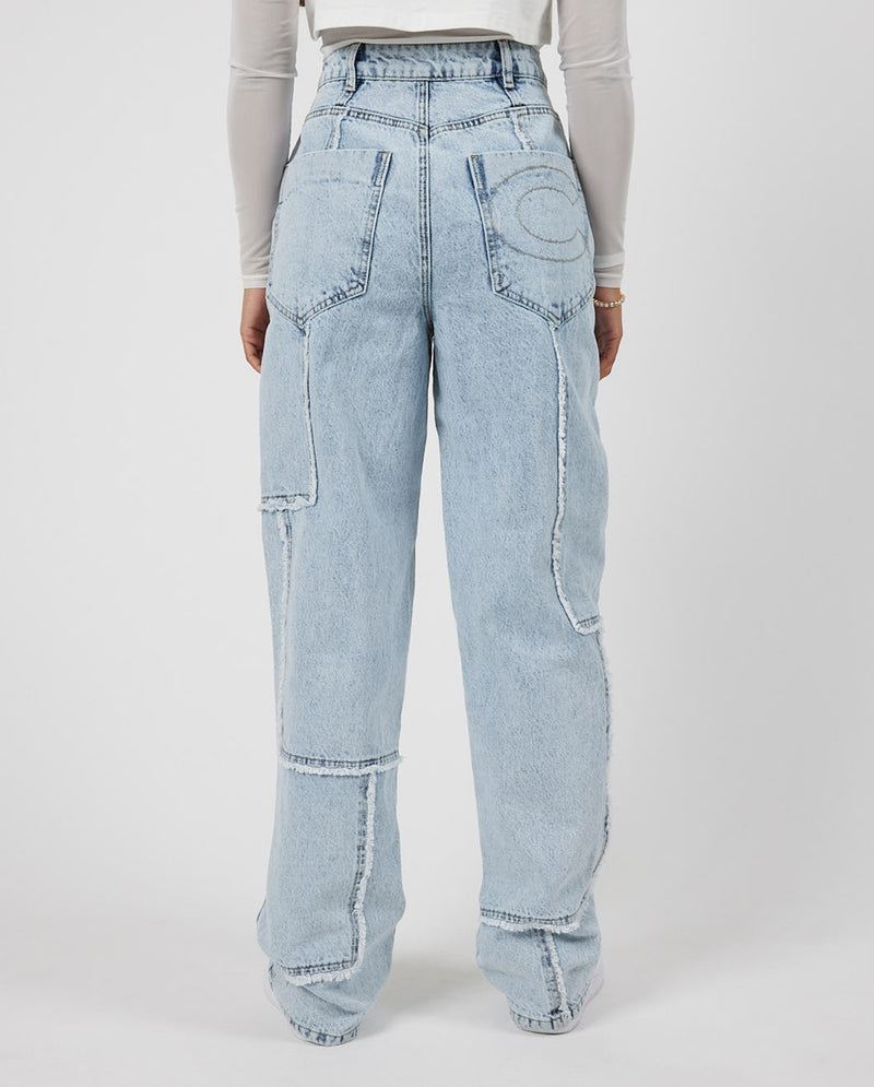 Ice blue washed jeans, in rigid cotton denim. Baggy fit finished with raw edge detail.