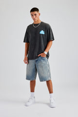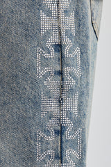 Mid blue bermuda short, in rigid cotton denim, featuring rhinestone motif trim.