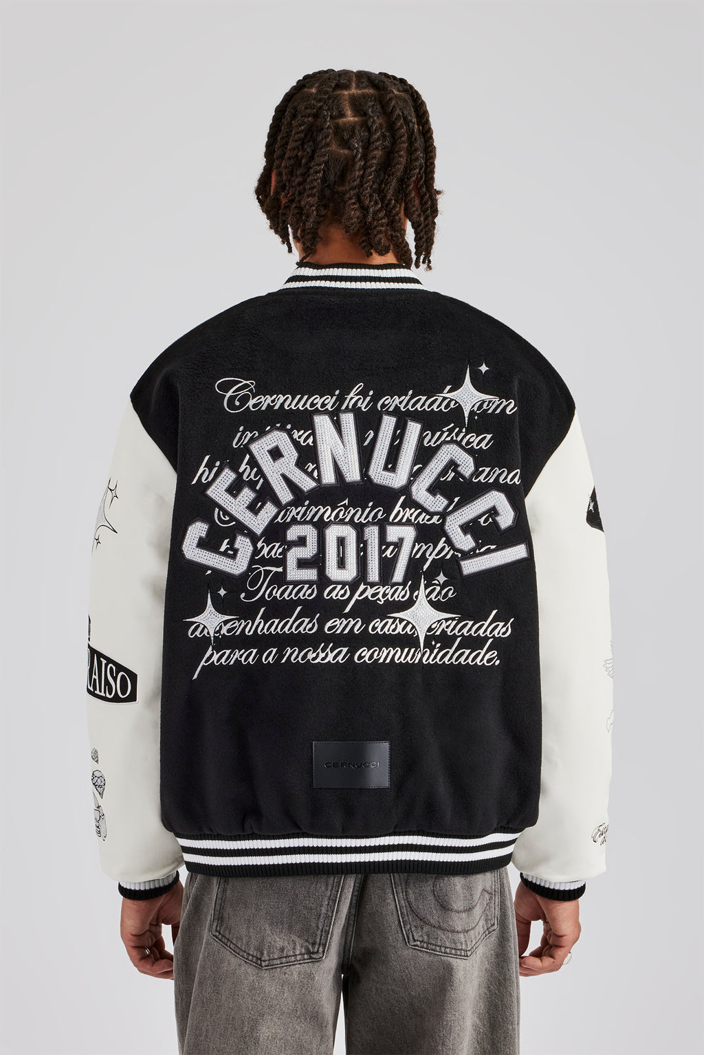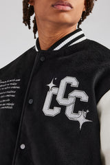 Black Rhinestone Bomber with embroidered and applique badge detail. Relaxed boxy fit in a heavyweight Melton with branded lining.