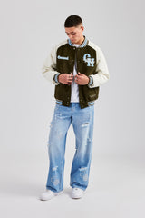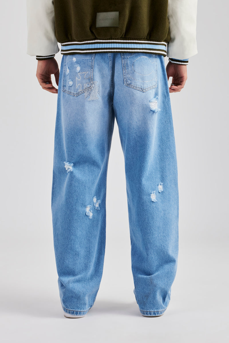 Mid blue distressed jeans, in rigid cotton denim. Baggy fit finished with branded trims and motif detail.