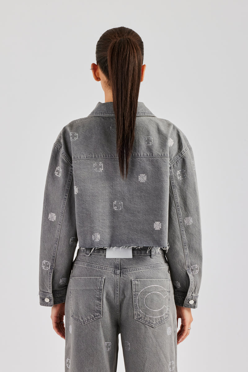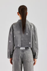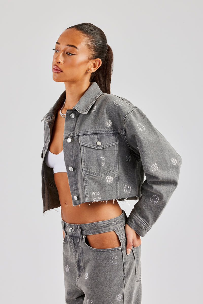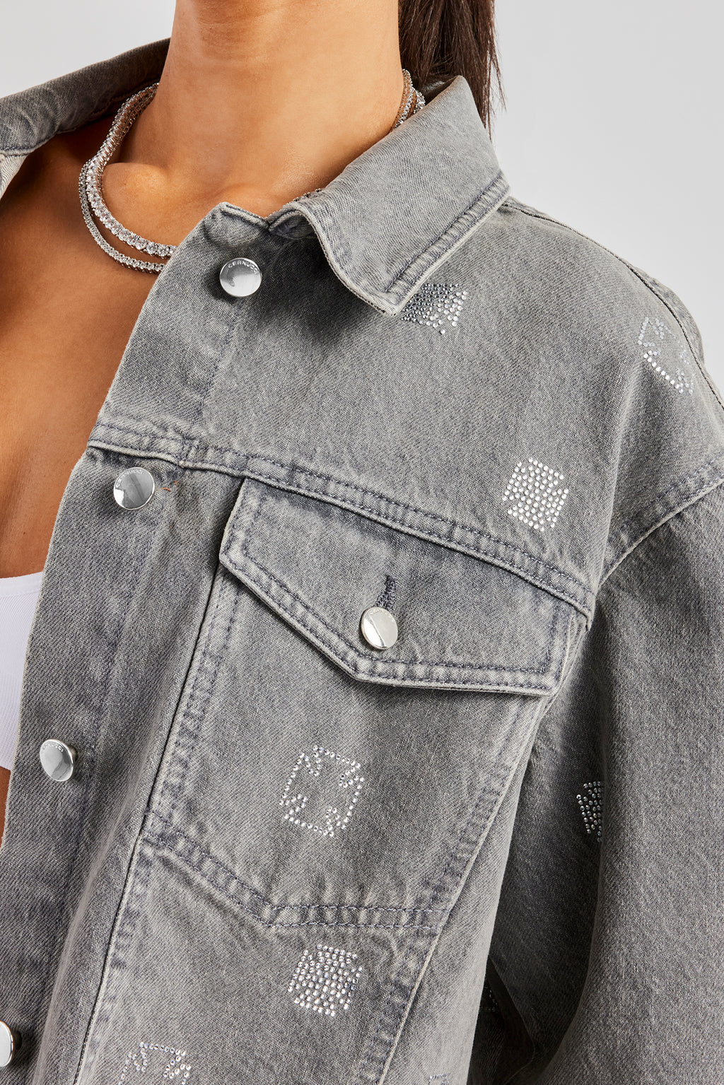 Washed grey denim jacket, an oversized fit, in rigid cotton denim, featuring rhinestone all over details. Pair with the matching jeans for the full look.