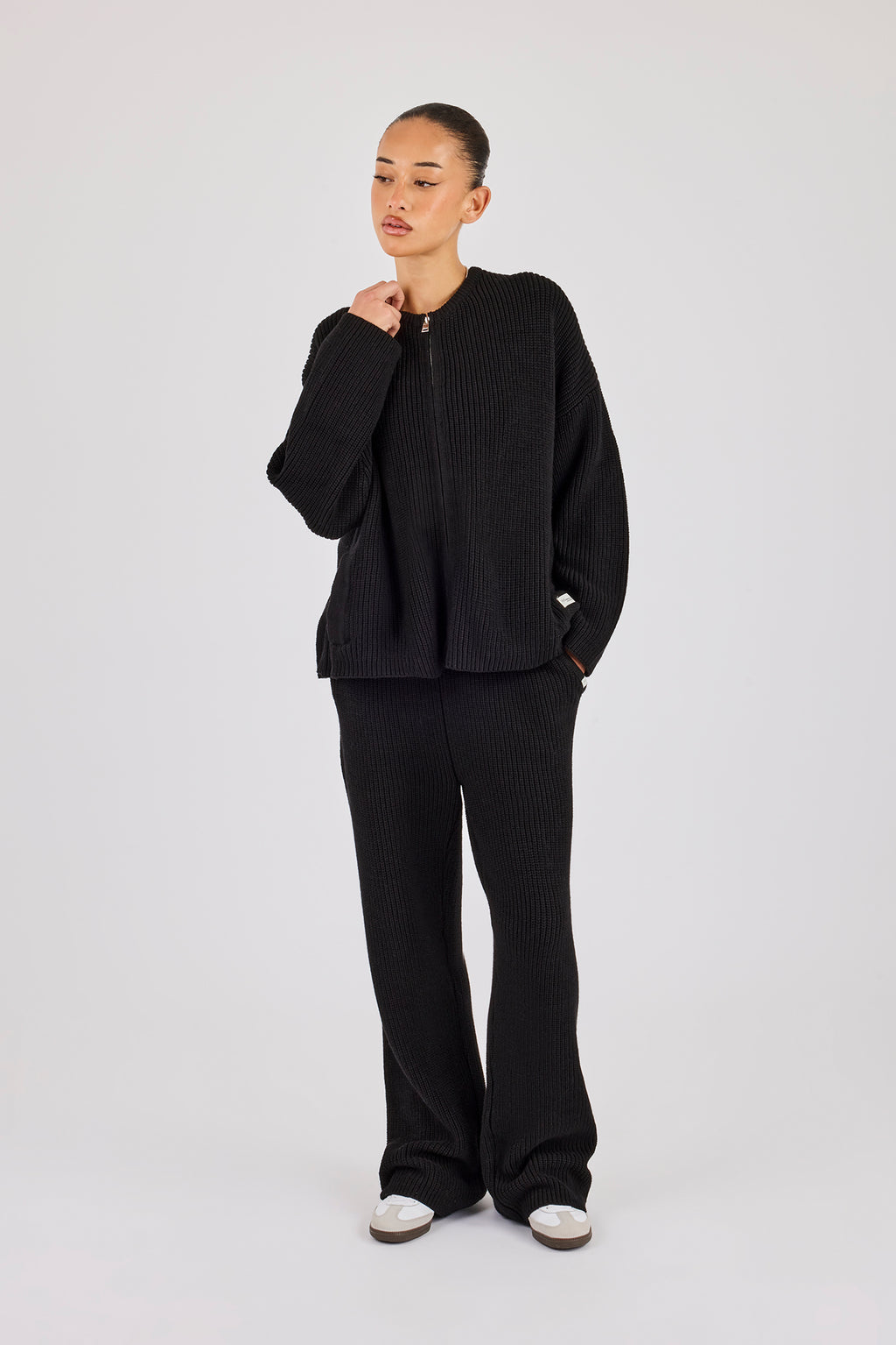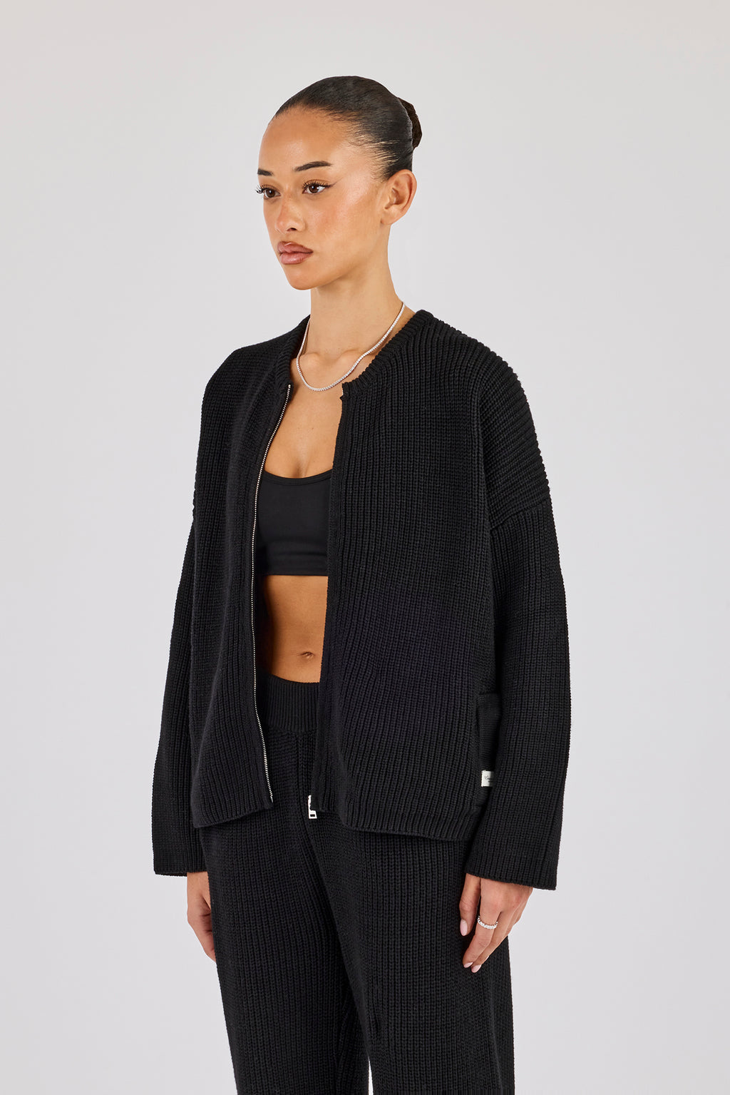 Black zip bomber in a soft touch knit with Cernucci branded tab and ribbed detailing.
