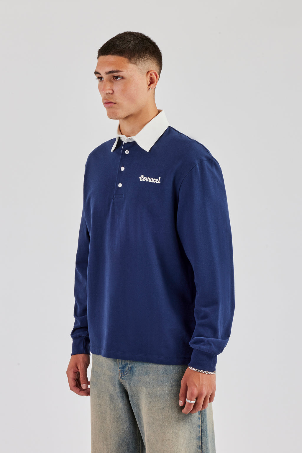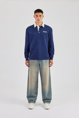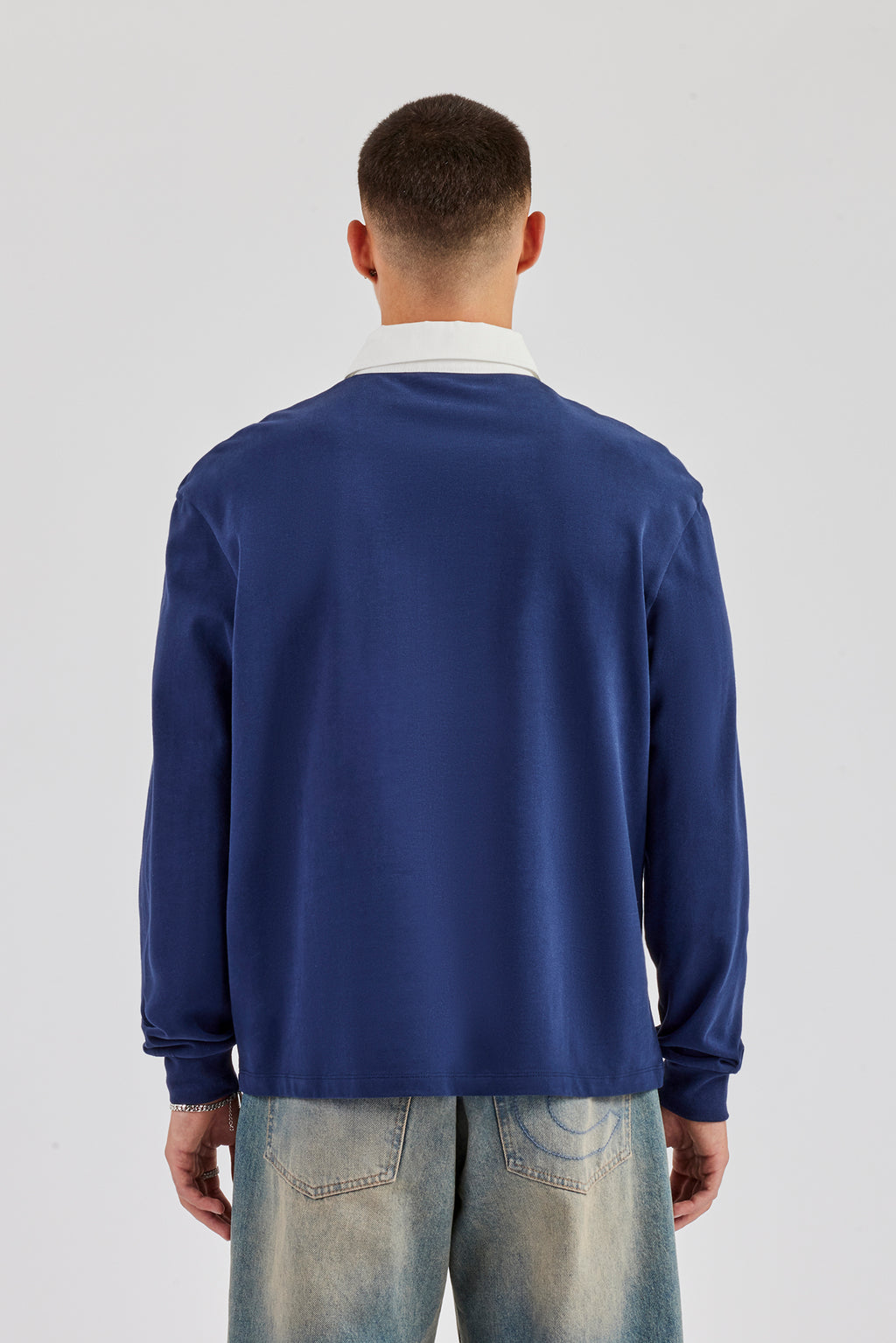 Long sleeve navy rugby polo with contrast collar & ribbed cuff.