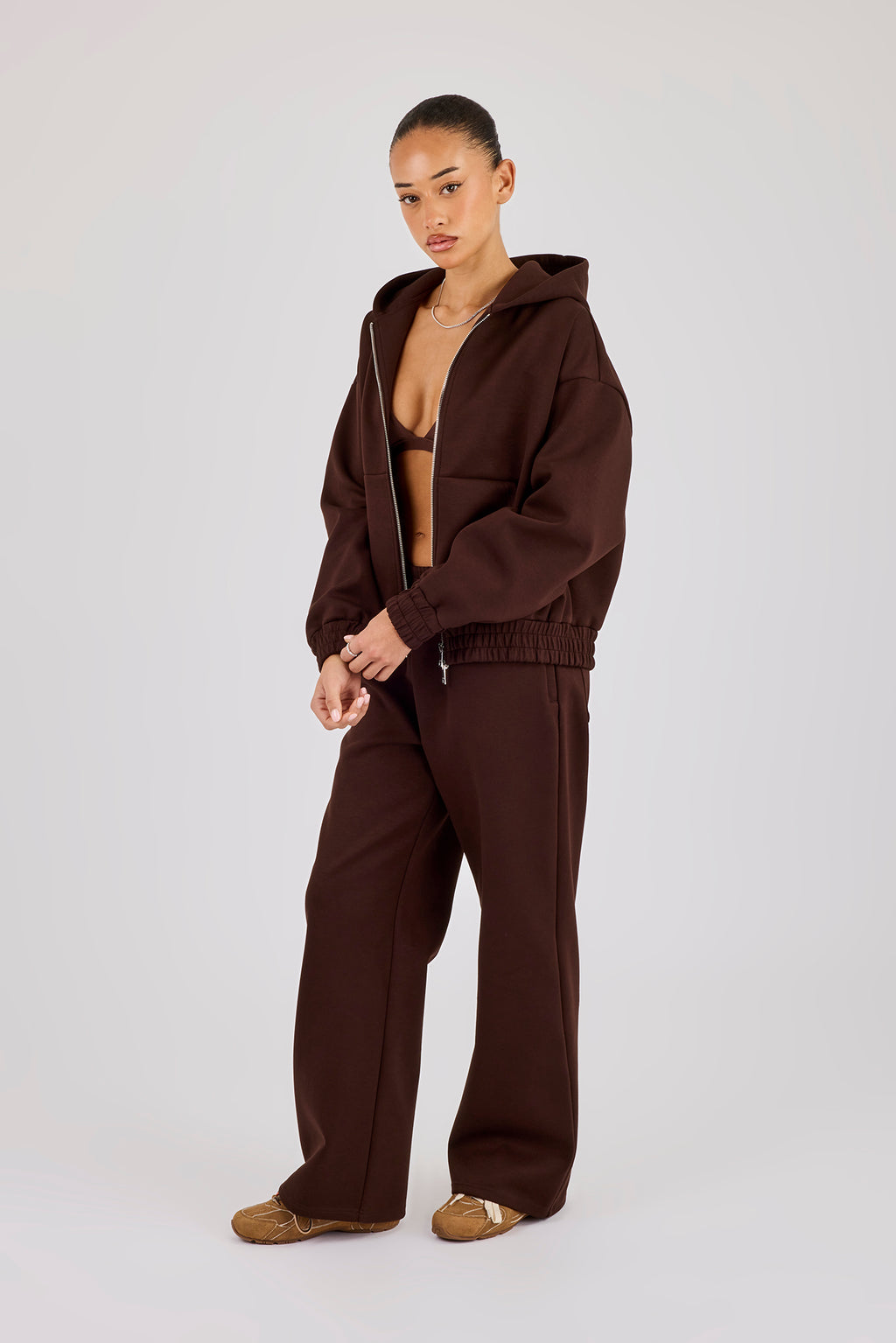 Chocolate zip through scuba hoodie, made from soft touch premium scuba featuring. Pair with our matching trouser to complete the look.