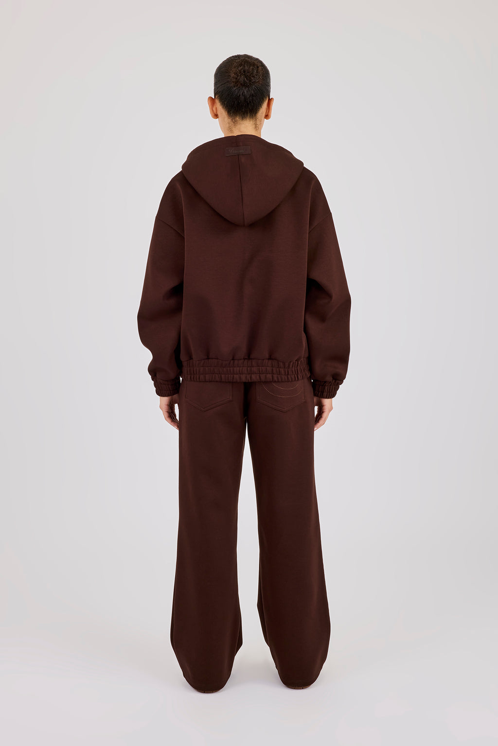 Chocolate scuba jogger in a wide leg fit. Premium soft touch scuba