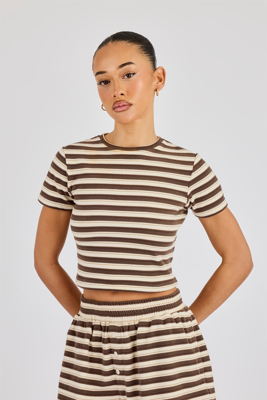 Soft touch short sleeve striped top with embroidered branding at back neck. Pair with the matching short/trouser to complete the look.