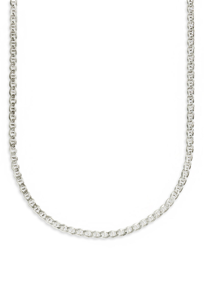 This chain features strong, tightly-spaced unique shaped links, giving this classic design a bold look. Designed to be worn 24/7. This is a subtle piece that will do the talking for you.