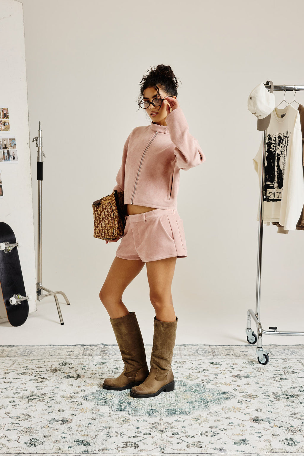 Dusty pink biker zip through jacket. Premium soft touch suede with branded trims.