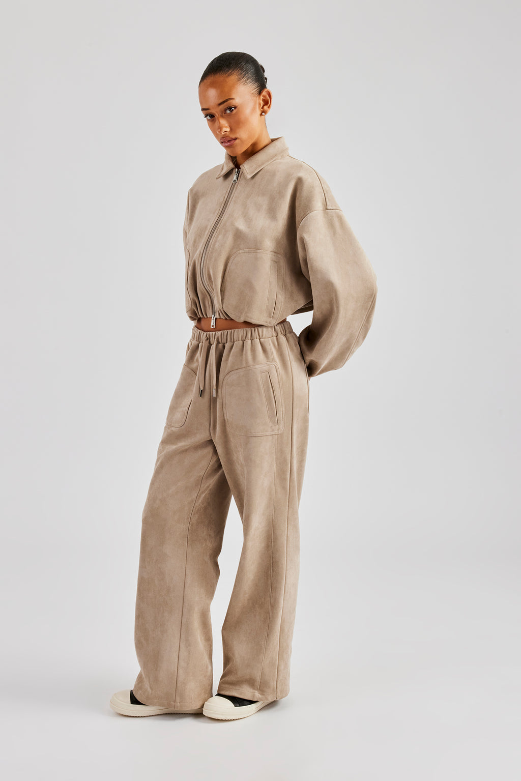 Beige Wide Leg Jogger. Premium soft touch suede with pocket detail and branded trims.