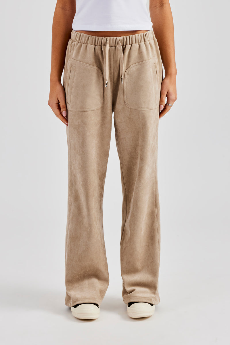 Beige Wide Leg Jogger. Premium soft touch suede with pocket detail and branded trims.