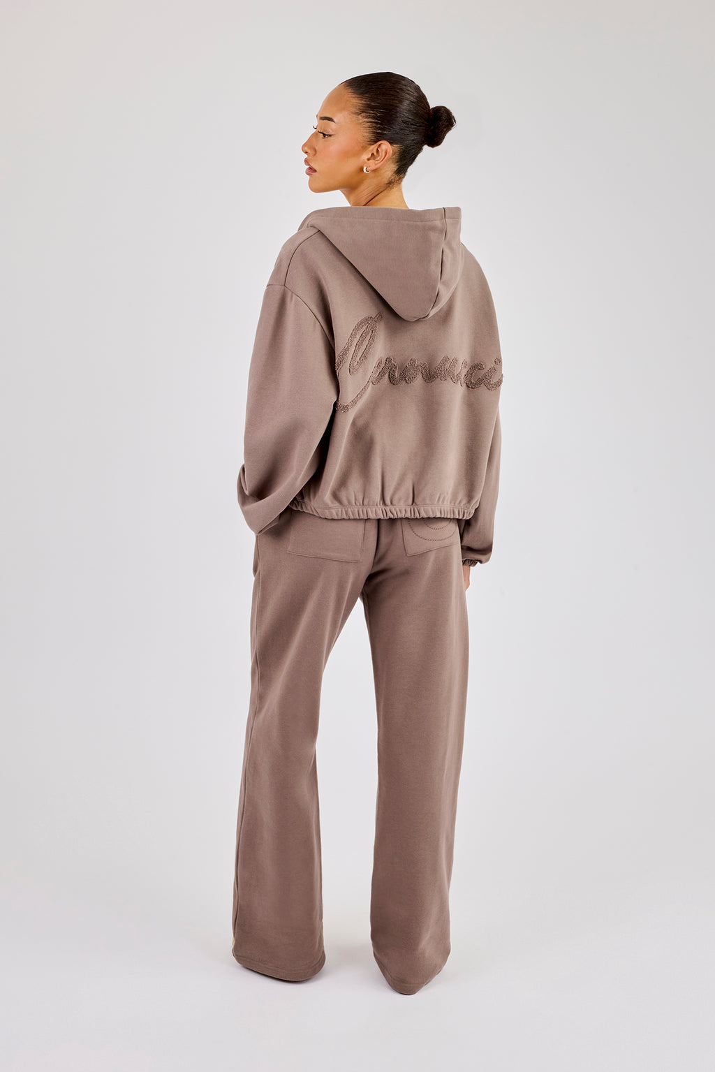 Taupe wide leg joggers with towelling applique. Premium heavyweight jersey, with Cernucci branded PU patch on centre back waistband.