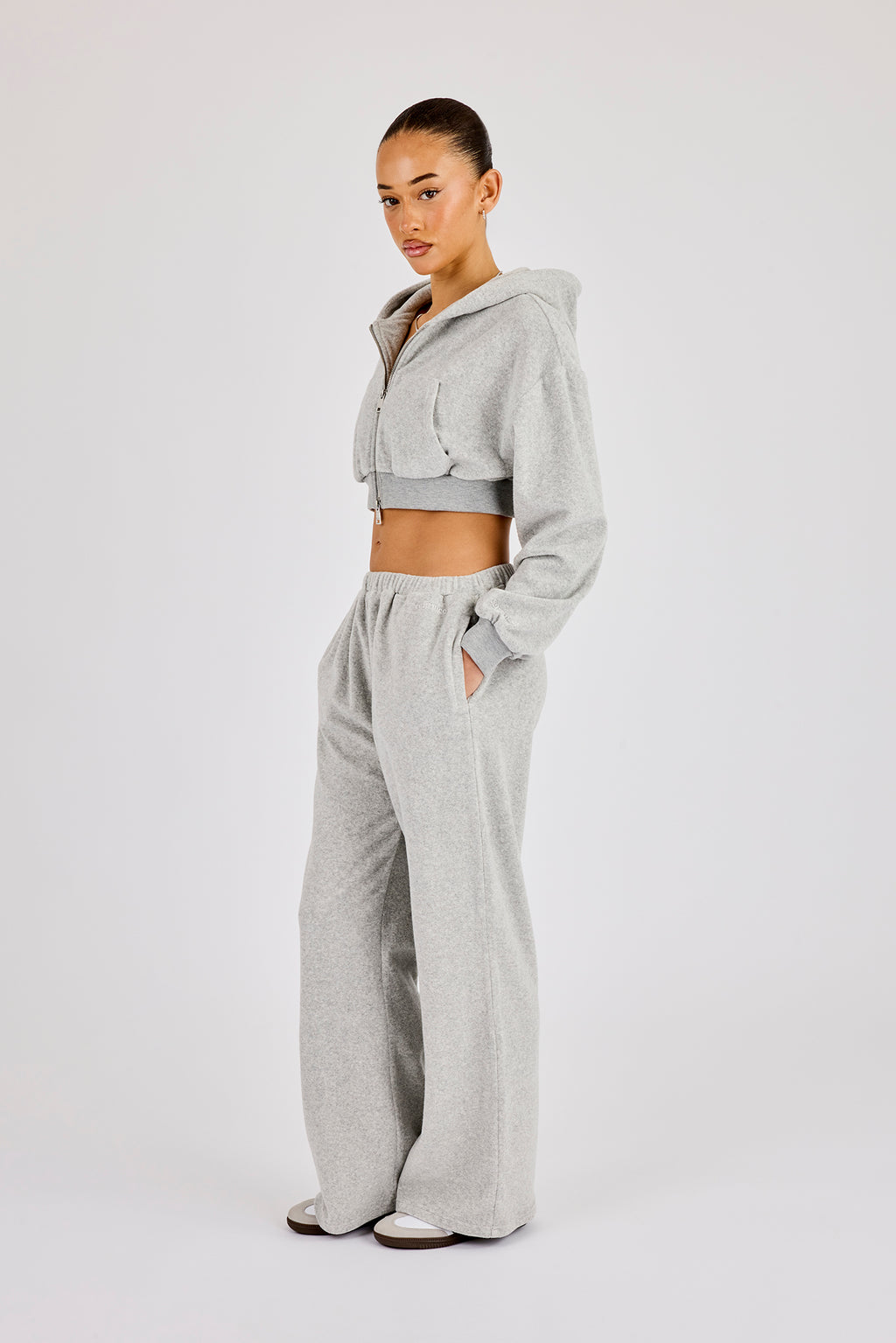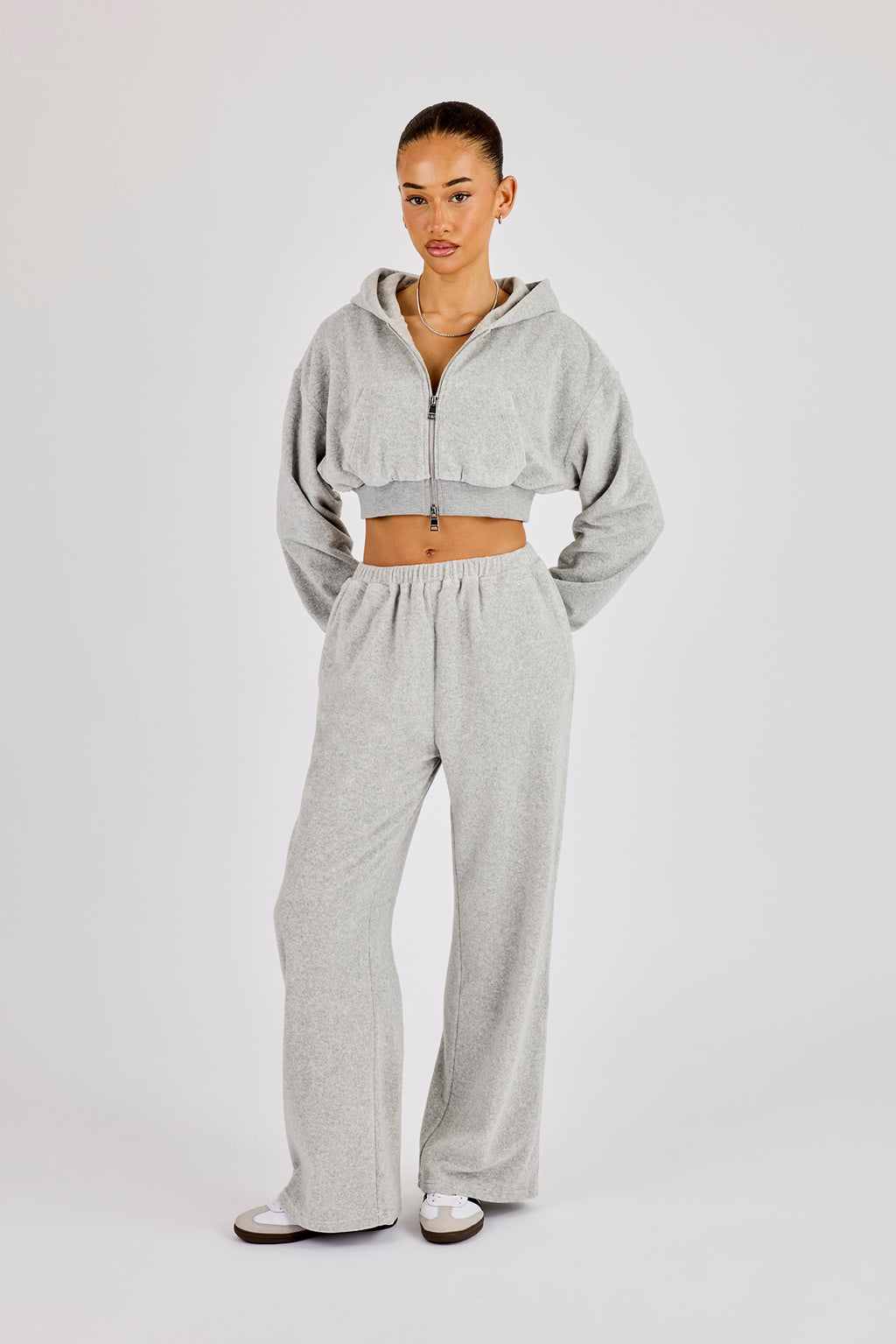 Grey towelling, wide leg jogger. Pair with our matching cropped zip through for the full look.