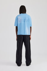 Washed blue t-shirt featuring tonal applique branding. Boxy fit in a medium weight, soft touch cotton.
