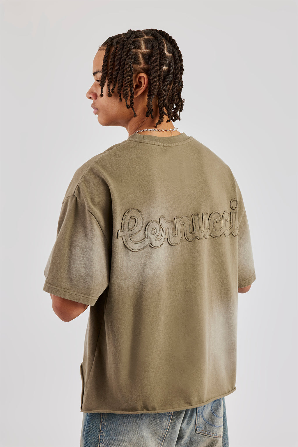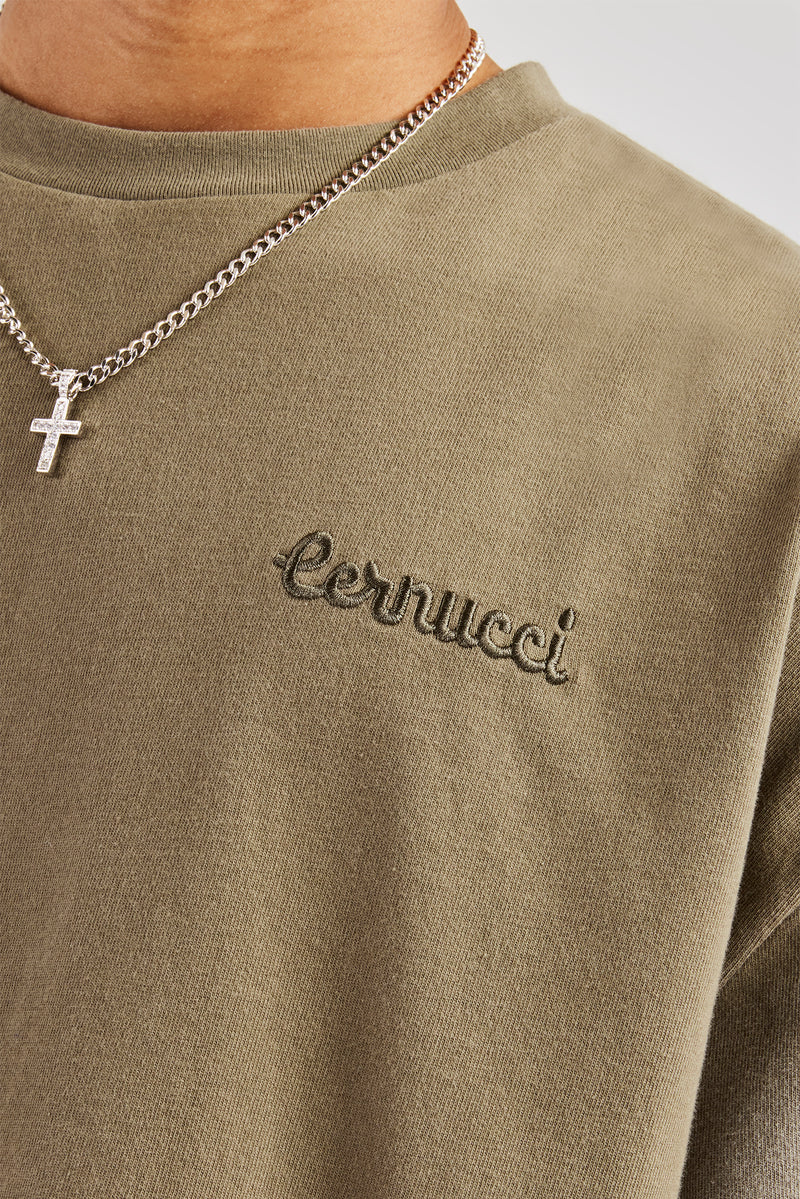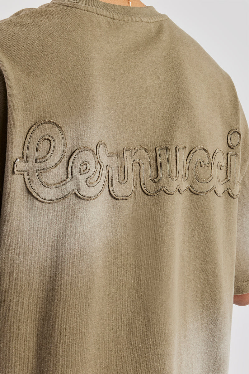Khaki washed t-shirt featuring front and back embroidered and applique branding. Boxy fit in a medium weight, soft touch cotton.