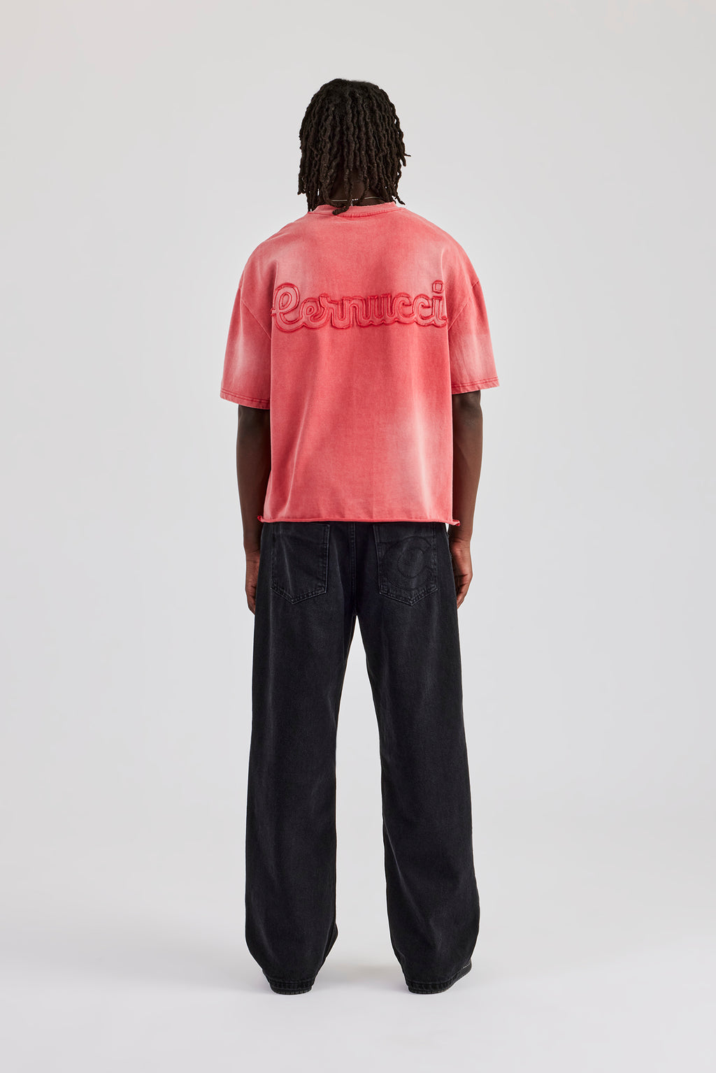 Washed red t-shirt featuring tonal applique branding. Boxy fit in a medium weight, soft touch cotton.