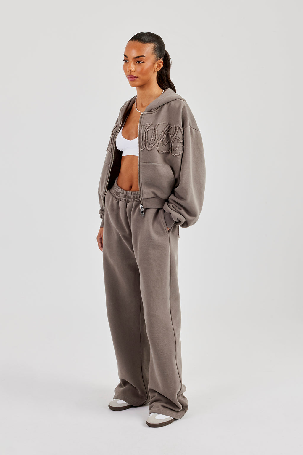 Washed Applique Logo Boxy Zip Through Hoodie & Wide Leg Jogger - Grey