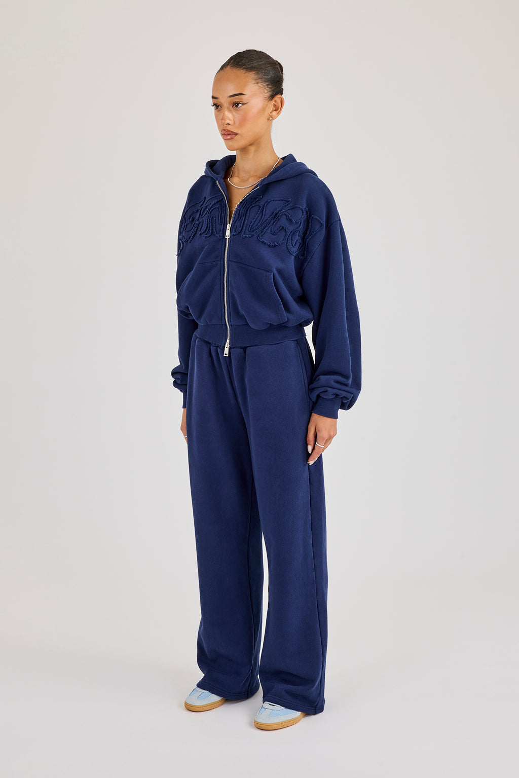 Navy wide leg jogger featuring applique logo. Premium soft touch jersey with Cernucci branded PU patch on centre back waistband.