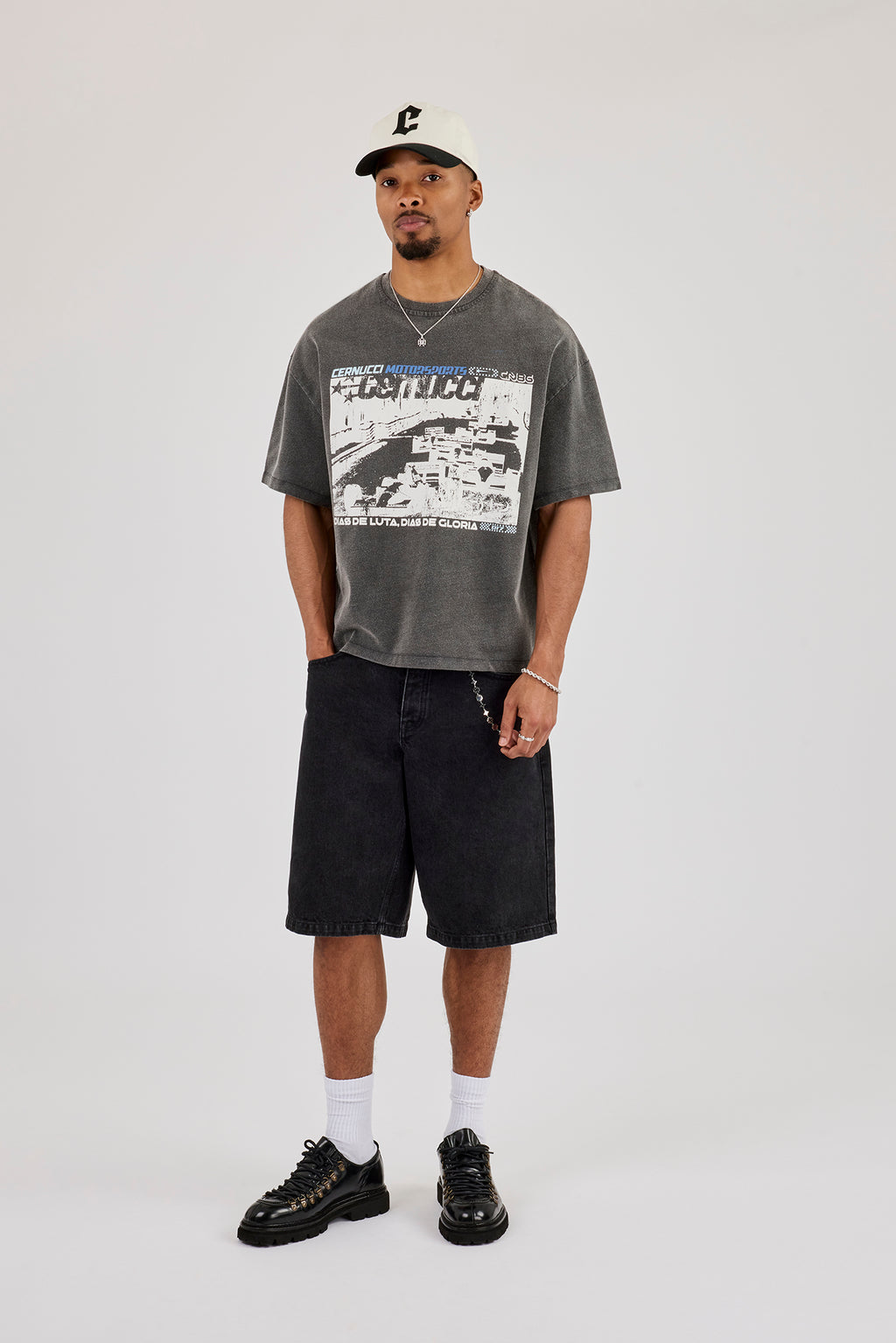 Washed charcoal short sleeve t-shirt featuring front graphic print. Boxy fit, dropped shoulders in a soft touch premium jersey.