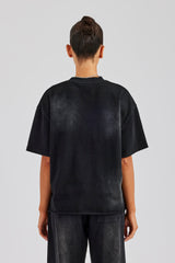 Black washed t-shirt featuring applique branding. Oversized fit in a medium weight, soft touch cotton.